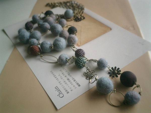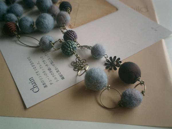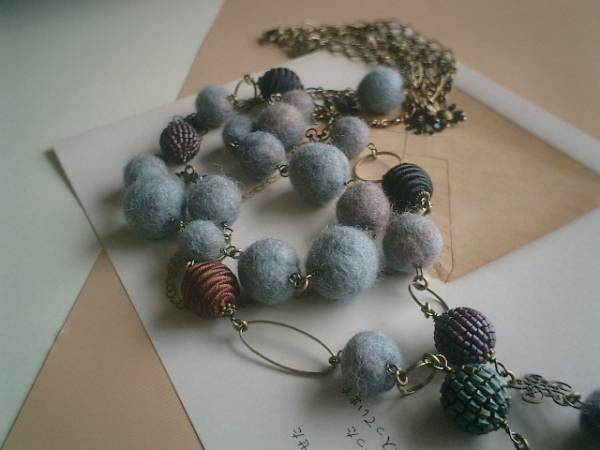 秋色・コレクション・・シリーズです♪私的な水色・・ふんわりやさしいフェルト玉のネックレス2点セットです♪シックなブルーグレーのフェルト玉は13ミリから20ミリ位までの大きさ違いです♪長い方のデザインはサテンボールやビーズ玉やお花のデザインチャームを合わせて可憐な表情です♪長さは全長110センチ位で調節自由です♪2連にされても素敵です♪シンプルなデザインはフェルト玉を繋いで合わせやすいデザインです♪長さは全長70センチ位で調節自由です♪それぞれ単品やお揃いのブレスレットも出品しています♪シンプルで飽きのこないいつまでも着けられるデザインを考えて作りました!ハンドメイドをご理解頂いてノークレーム、ノーリターンでお願いします