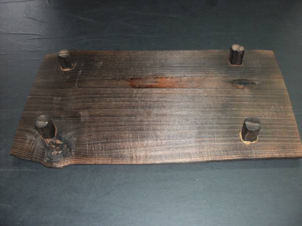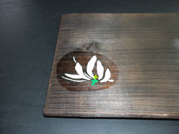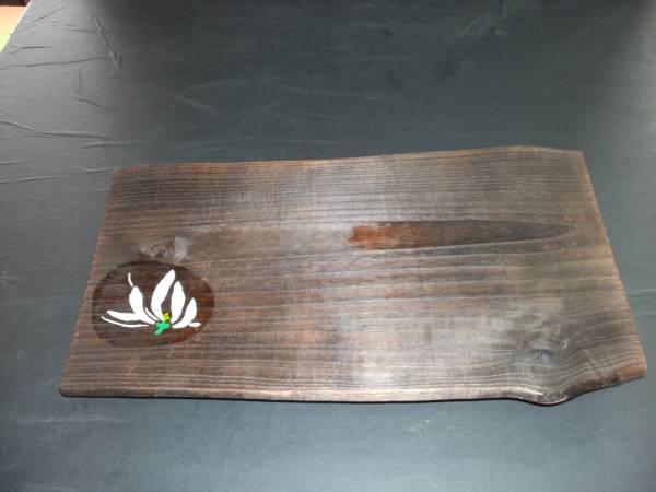 桐の一枚板を焼いて木目を浮き上がらせ、飾り台を作りました。材料の一枚板の自然の形を生かして飾り台にしました。そしてその黒い焼桐をバックに蘭蝶の白い絵を描いて飾り台のワンポイントにしました。