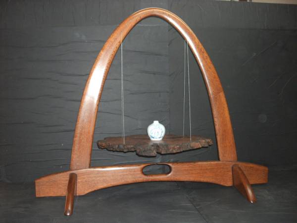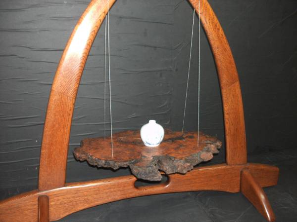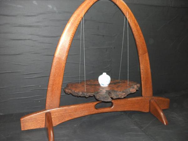 楢の木を使ってアーチを作りそのアーチから細いワイヤーで松のバール材(こぶ材)の板をアーチから吊り下げる思い切ったデザインの飾り台を作りました。全体の形は禅僧が座禅している様子を形にしたもので「天心」と名付けました。