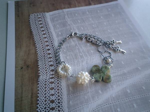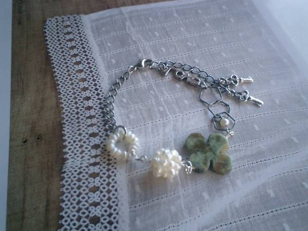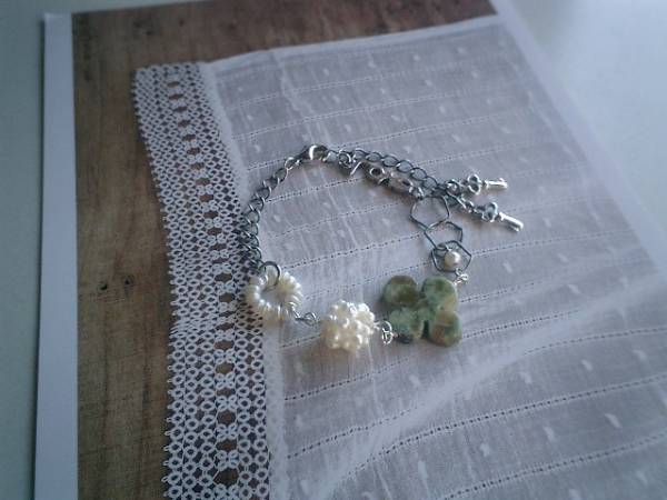 女の子の憧れ・・シリーズです♪パールとクローバー・・小さなパールリングやグリーンオパールのクローバーやデザインチェーンを合わせたロマンチックなブレスレットです♪パールリングは12ミリ、グリーンオパールのクローバーは20ミリ位です♪ヘキサゴンのデザインチェーンやラブチャームを添えてさりげなくデザインしています♪長さは全長23センチ位で調節自由です♪お揃いのネックレスも出品しています♪シンプルで飽きのこないいつまでも着けられるデザインを考えて作りました!ハンドメイドをご理解頂いてノークレーム、ノーリターンでお願いします