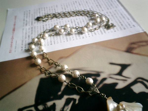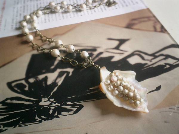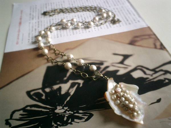 コレットの宝石箱・・シリーズです♪お気に入りのパール・・オフホワイトのコットンパールのネックレスです♪小さな淡水パールでおめかしした大きなシェルリーフを合わせてロマンチックな表情です♪コットンパールは8ミリの丸玉、トップのシェルリーフは55ミリ×35ミリ位です♪長さは全長88センチ位で調節自由です♪チョーカー風にされても素敵です♪お揃いのブレスレットも出品しています♪シンプルで長く着けられるデザインを考えて作りました!ハンドメイドをご理解頂いてノークレーム、ノーリターンでお願いします