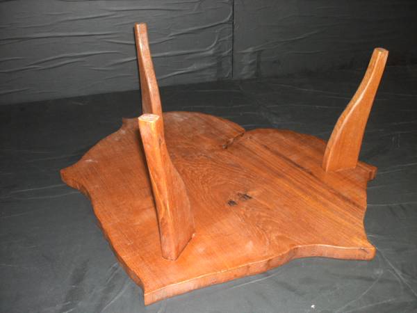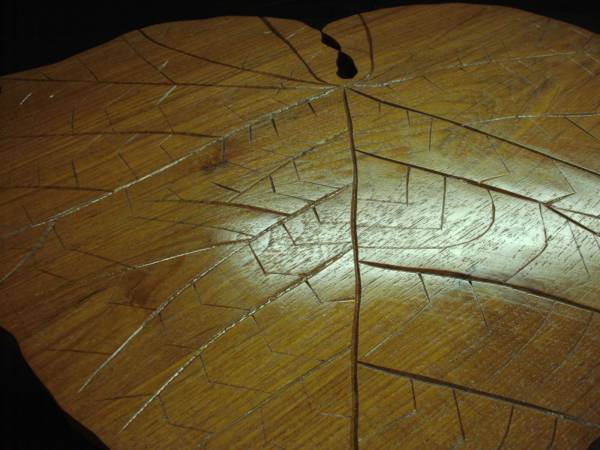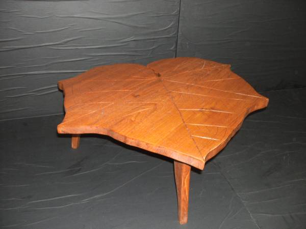 チークの一枚板を使って実寸の桐の葉を葉脈を彫り出して3本足の小卓を作りました。飾り台にちょっとした食事に、書き物にとあらゆるものに使える台として重宝すると思います。仕上げはポリウレタンのクリアで仕上げました。