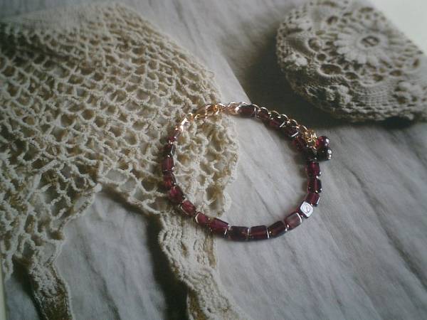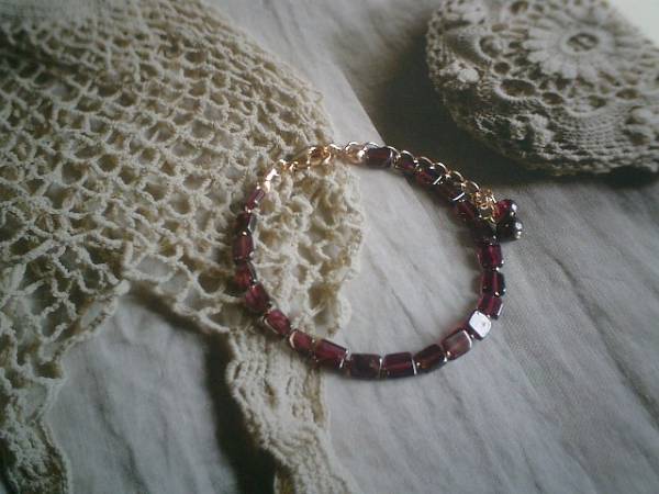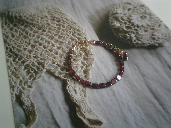 ナチュラル気分・・シリーズです♪退廃の巴里・・深い赤のガーネットのブレスレットです♪シックなピンクゴールドのチェーンを合わせてアンニュイな表情です♪6×4ミリ位のスクエアカットのガーネットはシンプルで合わせやすいデザインです♪長さは16センチ+アジャスター6センチで最長22センチ位です♪お揃いのネックレスも出品しています♪シンプルで飽きのこないいつまでも着けられるデザインを考えて作りました!ハンドメイドをご理解頂いてノークレーム、ノーリターンでお願いします
