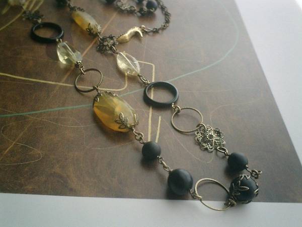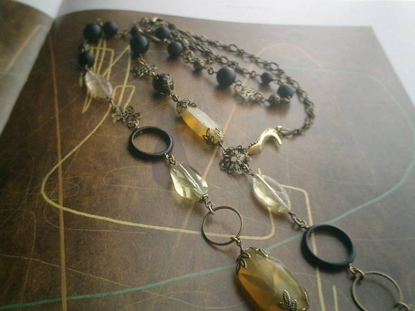 ジャンヌの手仕事・・シリーズです♪アーティスト仕様・・オニキスとイエローオパールのネックレスです♪シックな秋色でまとめました♪やさしい黒のマットオニキスは6ミリ、8ミリ、10ミリの丸玉です♪クラシカルな座金でおめかししたイエローオパールは22ミリから25ミリ位のラフカットです♪シトリンのマーキスやラフカットのレモン水晶、オニキスリングや透かしチャームのデザイン違いを合わせて大人のロマンチックしています♪長さは全長105センチ位で調節自由です♪2連にされても素敵です♪♪お揃いのブレスレットも出品しています♪♪シンプルで飽きのこないいつまでも着けられるデザインを考えて作りました!ハンドメイドをご理解頂いてノークレーム、ノーリターンでお願いします