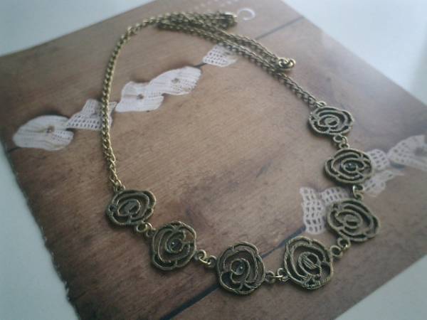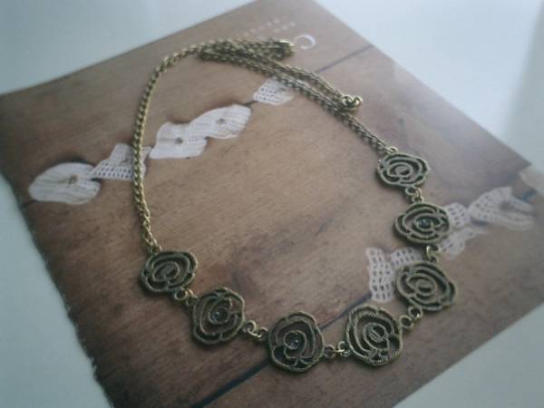 ロゼッタのおめかし・・シリーズです♪薔薇とクロス・・シックな薔薇のネックレスです♪♪20ミリ位の薔薇のメタルチャームのネックレスはキュートな表情です♪長さは全長67センチ位で調節自由です♪お揃いのネックレスやブレスレットやピアスも出品しています♪♪シンプルで長く着けていただけるデザインを考えて作りました♪ハンドメイドをご理解頂いてノークレーム、ノーリターンでお願いします