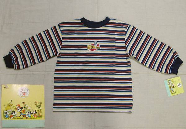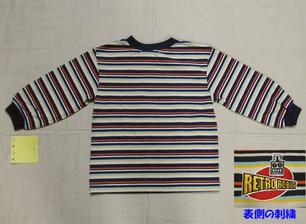 RETORO ROBOTの刺繍が入ったカラフルな縞柄のTシャツです。