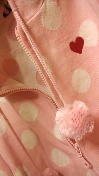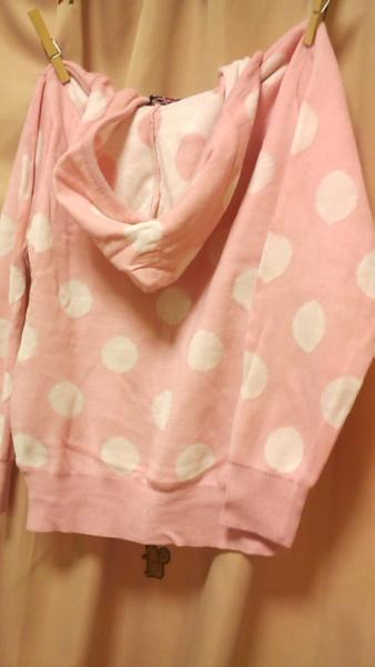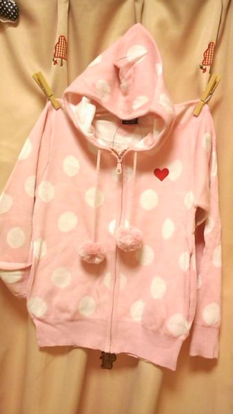 ◆可愛い水玉ドット柄に胸ハート刺繍♪フード紐先にポンポン付♪裏が逆カラーのWニットになっています♪ニット素材の姫系ジップアップパーカー