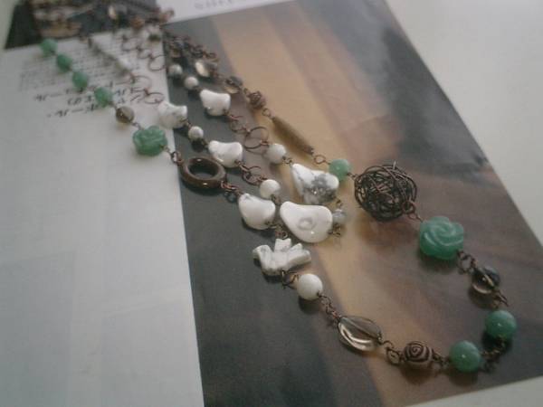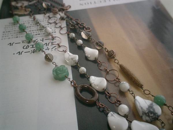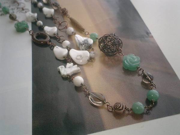 後ろボタンのワンピース・・シリーズです♪白い小鳥さんと薔薇のネックレス2本セットです♪グリーンアベンチュリンの薔薇とホワイトハウライトの小鳥さんが可憐な表情です♪小鳥さんのネックレスは8ミリの丸玉、14ミリの両面薔薇のグリーンアベンチュリンにスクエア、フラットオーバル、8ミリの丸玉のスモーキークォーツや8ミリのランダムカット、小鳥さん、ツイストオーバルのホワイトハウライト、薔薇のウッド、ワイヤー玉など個性的な素材を合わせてキュートモダンしています♪長さは全長98センチ位で調節自由です♪2連にされても素敵です♪6ミリの丸玉、8ミリのランダムカット、16×13ミリ、15×20ミリのツイストオーバルのホワイトハウライトにはデザインチェーンを合わせてシンプルモダンなデザインです♪長さは全長70センチ位で調節自由です♪それぞれ単品やブレスレットやイヤリングも出品しています♪シンプルで飽きのこないいつまでも着けられるデザインを考えて作りました!ハンドメイドをご理解頂いてノークレーム、ノーリターンでお願いします