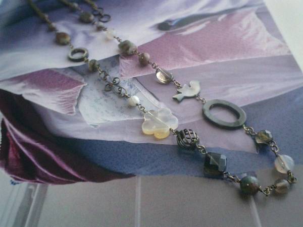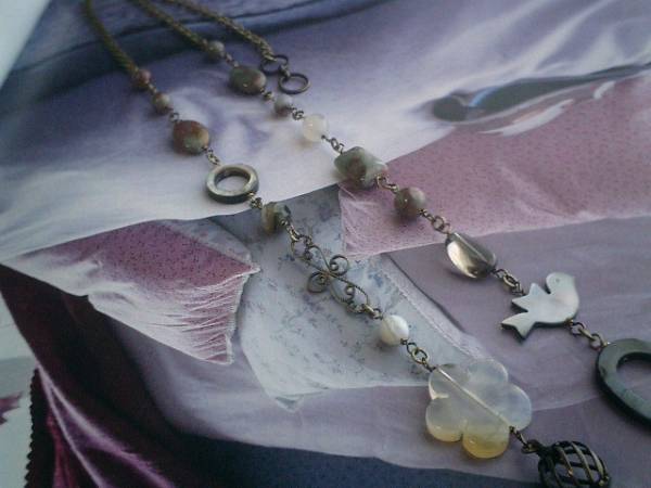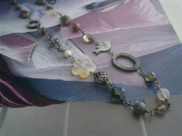 ジャンヌの手仕事・・シリーズです♪セピア色の小鳥さん・・シックな大人仕様のネックレスです♪グリーンガーネットやモスアゲート、スモーキークォーツなど繊細で個性的な石に小鳥さんやお花を合わせて可憐な表情です♪グリーンガーネットは6ミリ、8ミリの丸玉、10×14ミリのレグタングル、フラットオーバル、スモーキークォーツは10ミリのスクエアカット、フラットオーバル、モスアゲートは20ミリのお花や8ミリの丸玉、ボツワナアゲートは6ミリ、8ミリのランダムカット、ブラックシェルは25ミリ、12ミリのリング、20×12ミリの小鳥さんです♪デザインチャームを合わせてアンティークモダンしています♪長さは全長73センチ位で調節自由です♪同じデザインの長さ違いのネックレスやお揃いのブレスレットも出品しています♪♪シンプルで飽きのこないいつまでも着けられるデザインを考えて作りました!ハンドメイドをご理解頂いてノークレーム、ノーリターンでお願いします
