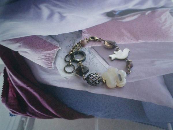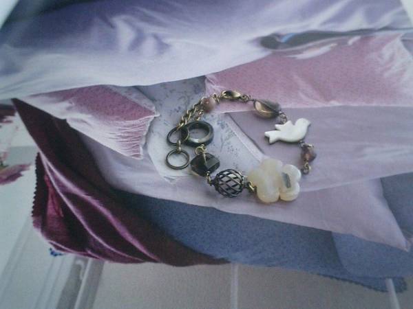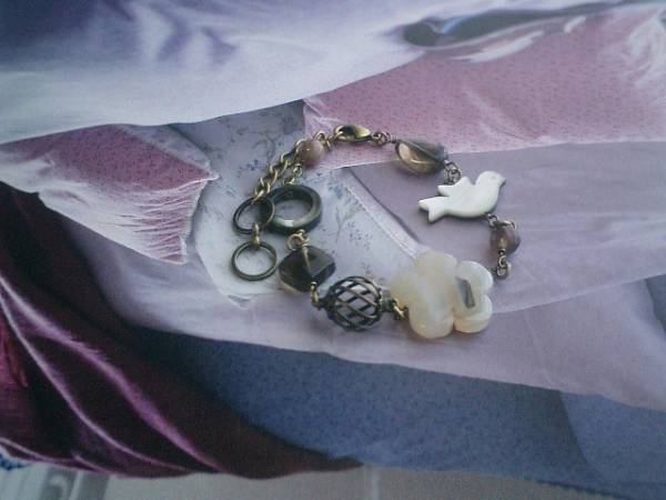 ジャンヌの手仕事・・シリーズです♪セピア色の小鳥さん・・シックな大人仕様のブレスレットです♪グリーンガーネットやモスアゲート、スモーキークォーツなど繊細で個性的な石に小鳥さんやお花を合わせて可憐な表情です♪グリーンガーネットは6ミリの丸玉、スモーキークォーツは10ミリのスクエアカット、フラットオーバル、モスアゲートは20ミリのお花、ボツワナアゲートは6ミリのランダムカット、ブラックシェルは12ミリのリング、20×12ミリの小鳥さんです♪デザインチャームを合わせてアンティークモダンしています♪長さは全長23センチ位で調節自由です♪お揃いのネックレスも出品しています♪♪シンプルで飽きのこないいつまでも着けられるデザインを考えて作りました!ハンドメイドをご理解頂いてノークレーム、ノーリターンでお願いします