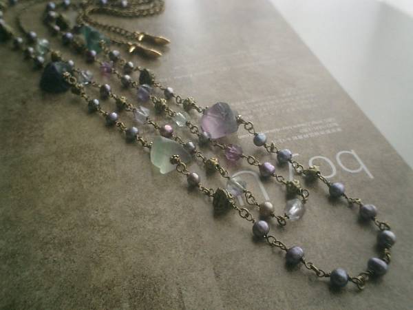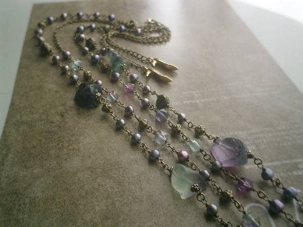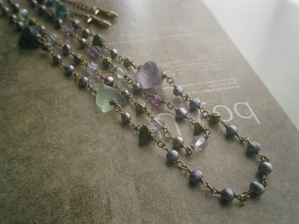 妖精のため息・・シリーズです♪儚げなフローライト・・神秘的なフローライトのネックレス2本セットです♪デザイン違いのフローライトのネックレスです♪長い方は16ミリから22ミリ位までのラフタンブルカットのフローライトに6ミリ位のパープルグレーのポテトの淡水パールを合わせました♪ナチュラルなカットが神秘的なフローライトにデザインメタルを合わせてアートな表情です♪長さは全長102センチ位で調節自由です♪2連にされても可愛いです♪8ミリ位のラフカットのフローライトは6ミリのポテトの淡水パールやデザインメタルを合わせて可憐な表情です♪長さは全長79センチ位で調節自由です♪2連にされても可愛いです♪それぞれ単品でも出品しています♪お揃いのブレスレットも出品しています♪♪シンプルで長く着けていただけるデザインを考えて作りました♪ハンドメイドをご理解頂いてノークレーム、ノーリターンでお願いします