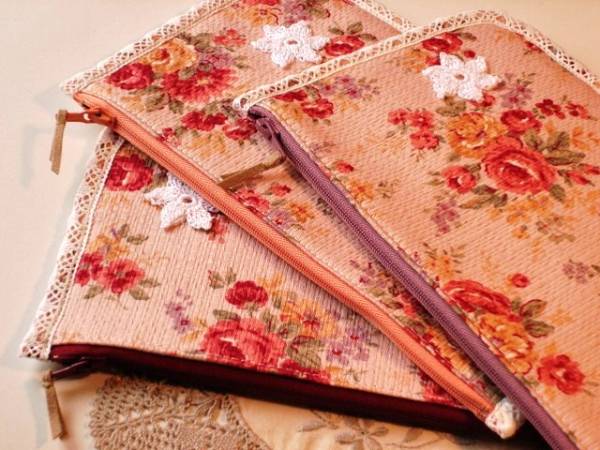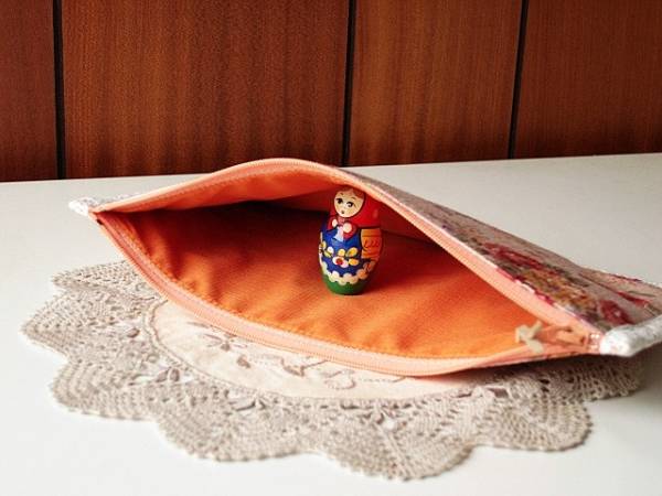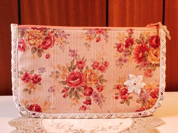 タテ 13.5cm ヨコ 22cm 表布: 変わり織りのローズブーケ柄 コットン 内布: オレンジのナイロン 明るいオレンジ色のファスナーで開閉 レーステープと手編みのお花がポイント♪ 通帳やはがきが楽に出し入れできるサイズです。 小物の整理にお役立て下さいませ。 | ||||
