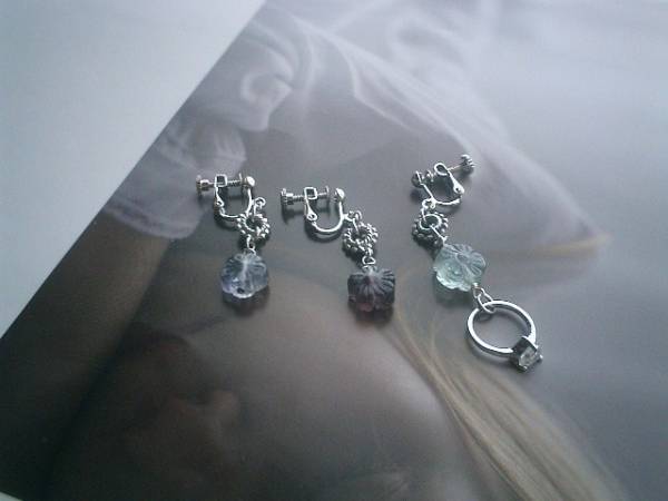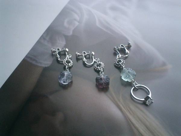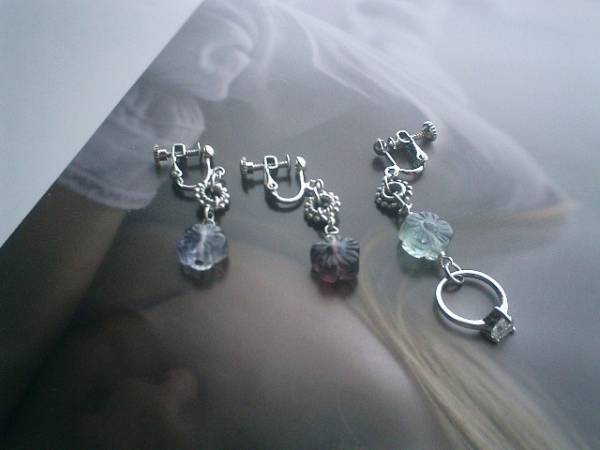 薔薇の帽子箱・・シリーズです♪アリスを探して・・可憐なフローライトのイヤリング3本セットです♪ペアが1組とデザイン違いが1本で合わせて3本セットです♪色々な組み合わせで楽しんでいただけます♪♪10ミリ位のお花のフローライトにジルコニアのリングやデザインリングを合わせてロマンチックな表情です♪長さはペアが4センチ、デザイン違いが6センチ位です♪♪ピアスにも変更出来ます♪お揃いのネックレスやブレスレットも出品しています♪♪シンプルで飽きのこないいつまでも着けられるデザインを考えて作りました!ハンドメイドをご理解頂いてノークレーム、ノーリターンでお願いします