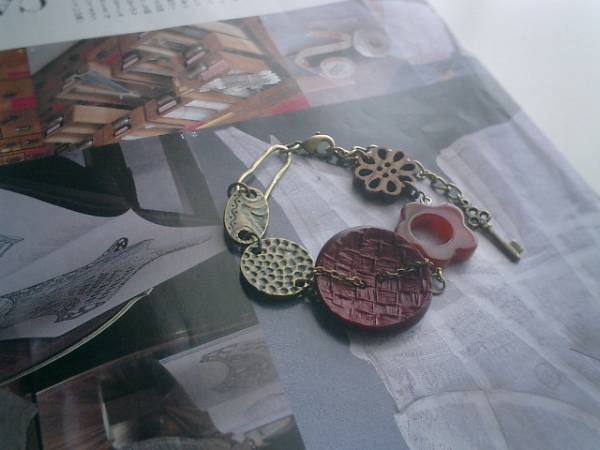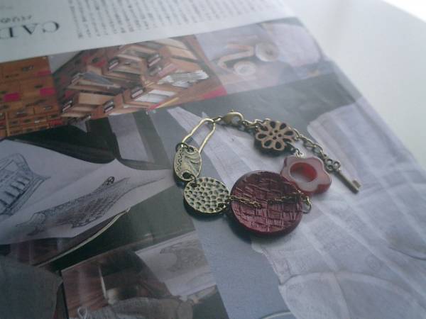 薔薇の帽子箱・・シリーズです♪キュートな異素材のブレスレットです♪深いダークレッドの異素材がアートな表情です♪20ミリのお花のカーネリアンや18ミリから28ミリ位までのウッドやアンティークボタンやデザインチャームなどの異素材を合わせたブレスレットはキュートモダンな表情です♪長さは全長23センチ位で調節自由です♪お揃いのブレスレットやネックレスも出品しています♪♪シンプルで飽きのこないいつまでも着けられるデザインを考えて作りました!ハンドメイドをご理解頂いてノークレーム、ノーリターンでお願いします