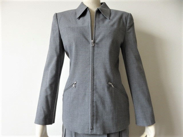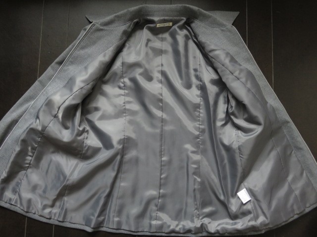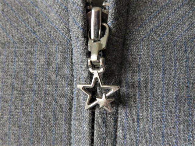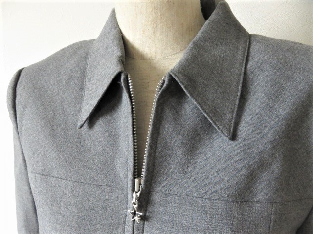 ジャケットは、ファスナー止め、斜めファスナー付きポケット、総裏地。