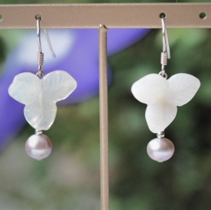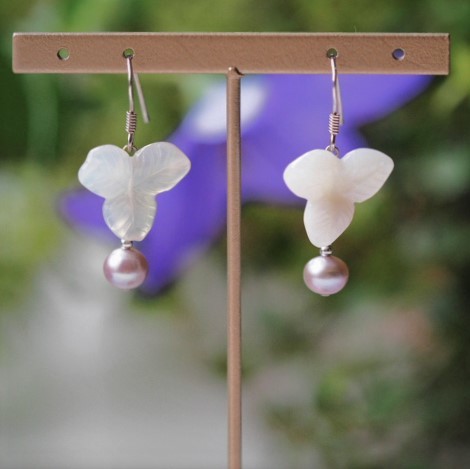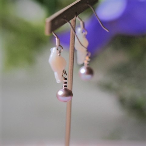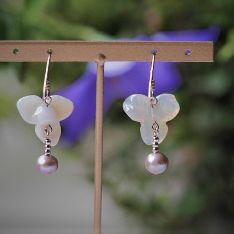 花びらを広げたような形状のホワイトグレーアゲートと天然グレー真珠の組合わせは
