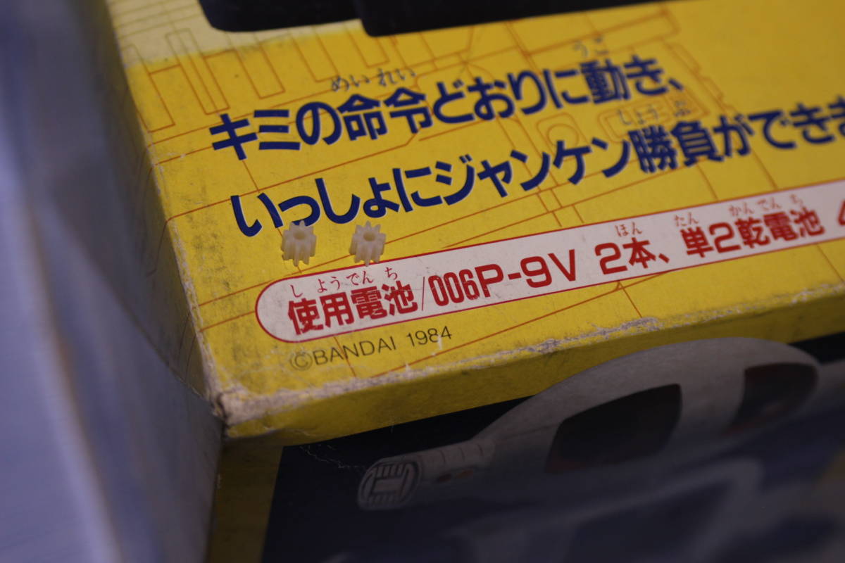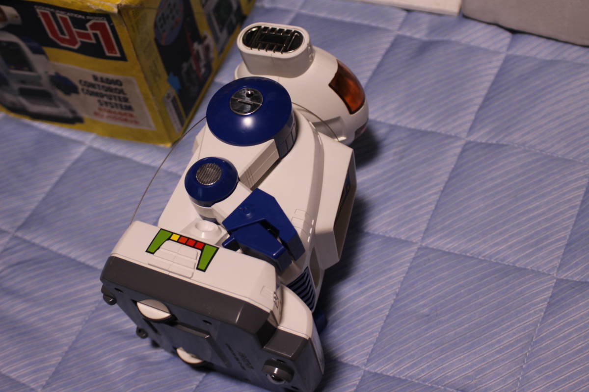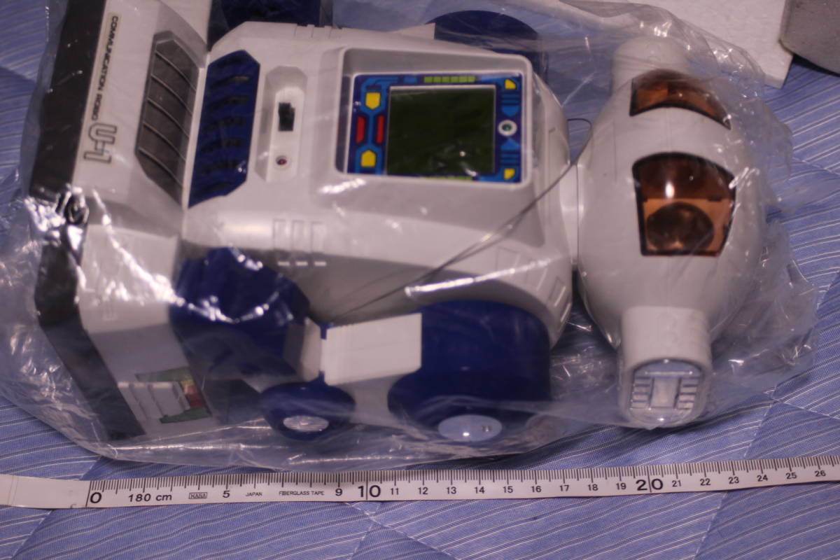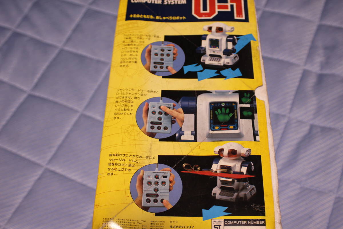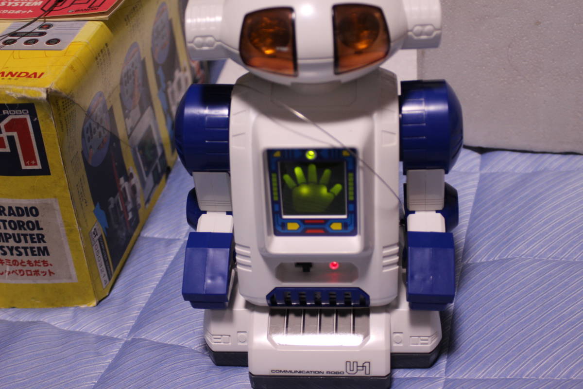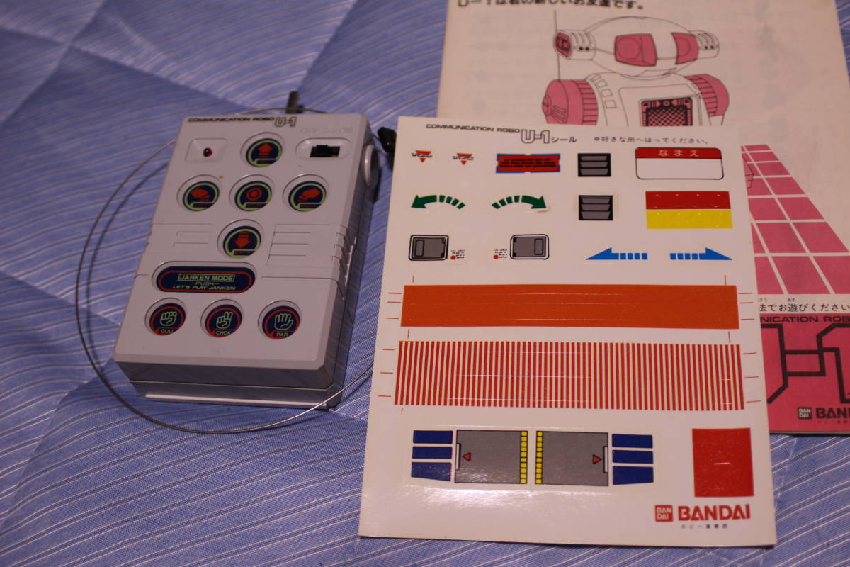 閲覧ありがとう御座います、バンダイ 1984製 ラジコンお喋りロボット U-1の出品です、未使用の物でしたが動作確認のため電池を入れチェックしました、昔の玩具の故障の定番で、こちらの商品もモーターのプラスティック製ピニオンギアが割れて空回りしていましたが、2つとも金属製ピニオンギアに交換したので、今は全ての動作を行えます、音声、ライト類、ジャンケンゲーム等も問題ありません、付属のデカールも状態は良いほうだと思います、古いものですが完動品のものです、箱には汚れや破れ等ありますのでご了承ください、陽の当たらない場所に保管していたので大変良い状態です。(チェックに使った電池もお付けします。)
