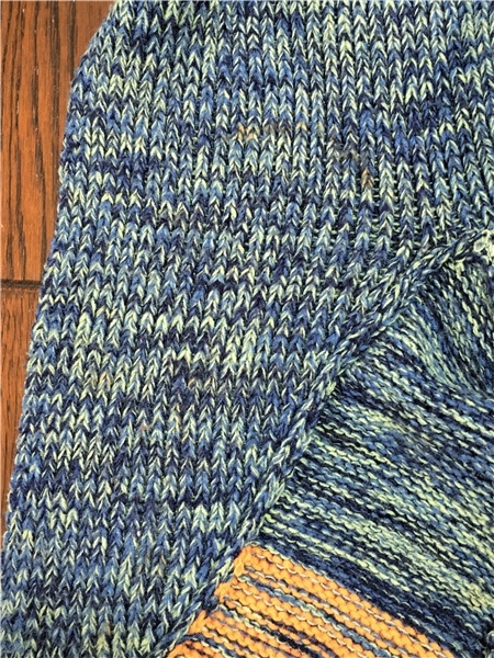 サイズは不明で、実寸で肩幅(背面直線)37cm、着丈(背面フードの付け根~裾)65.5 cm、身幅(前のブルー部分を重ね合わせた状態で脇下~脇下)46cm、袖丈(肩~袖先)56.5cmほどになります。