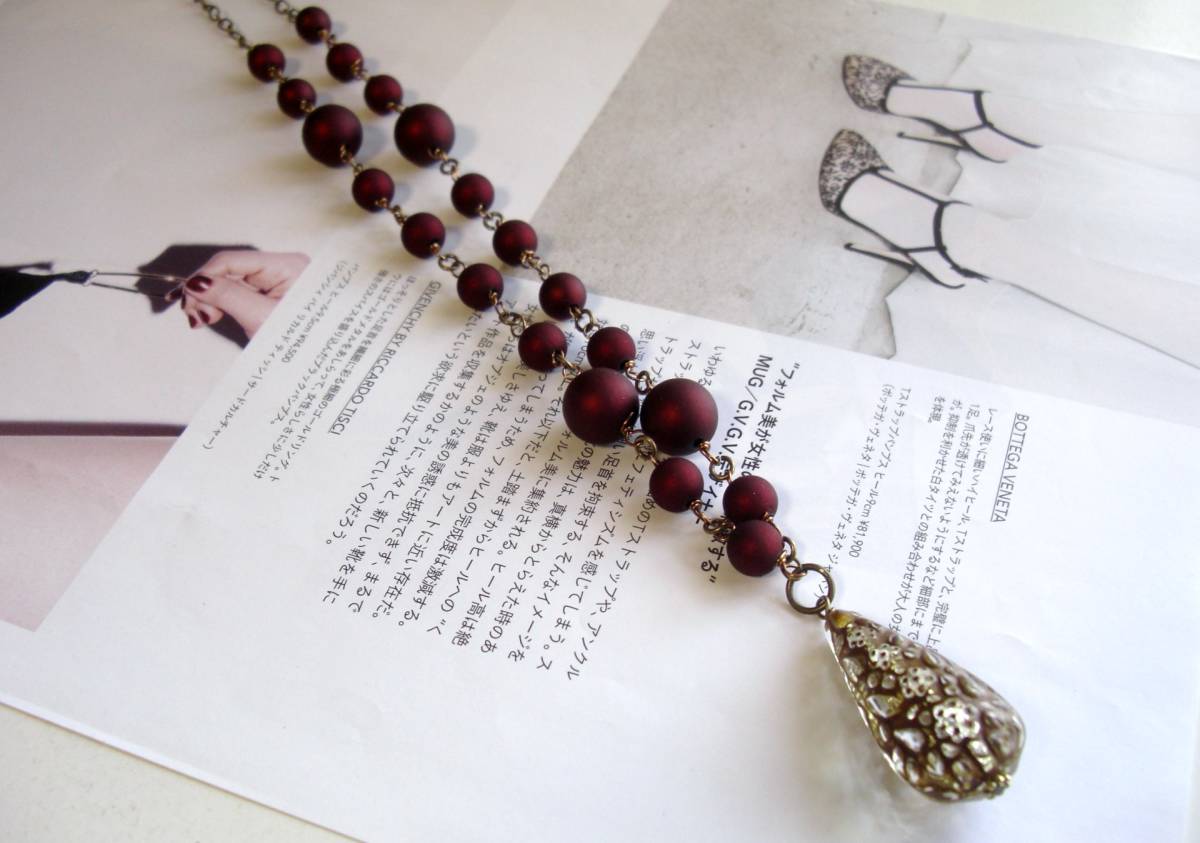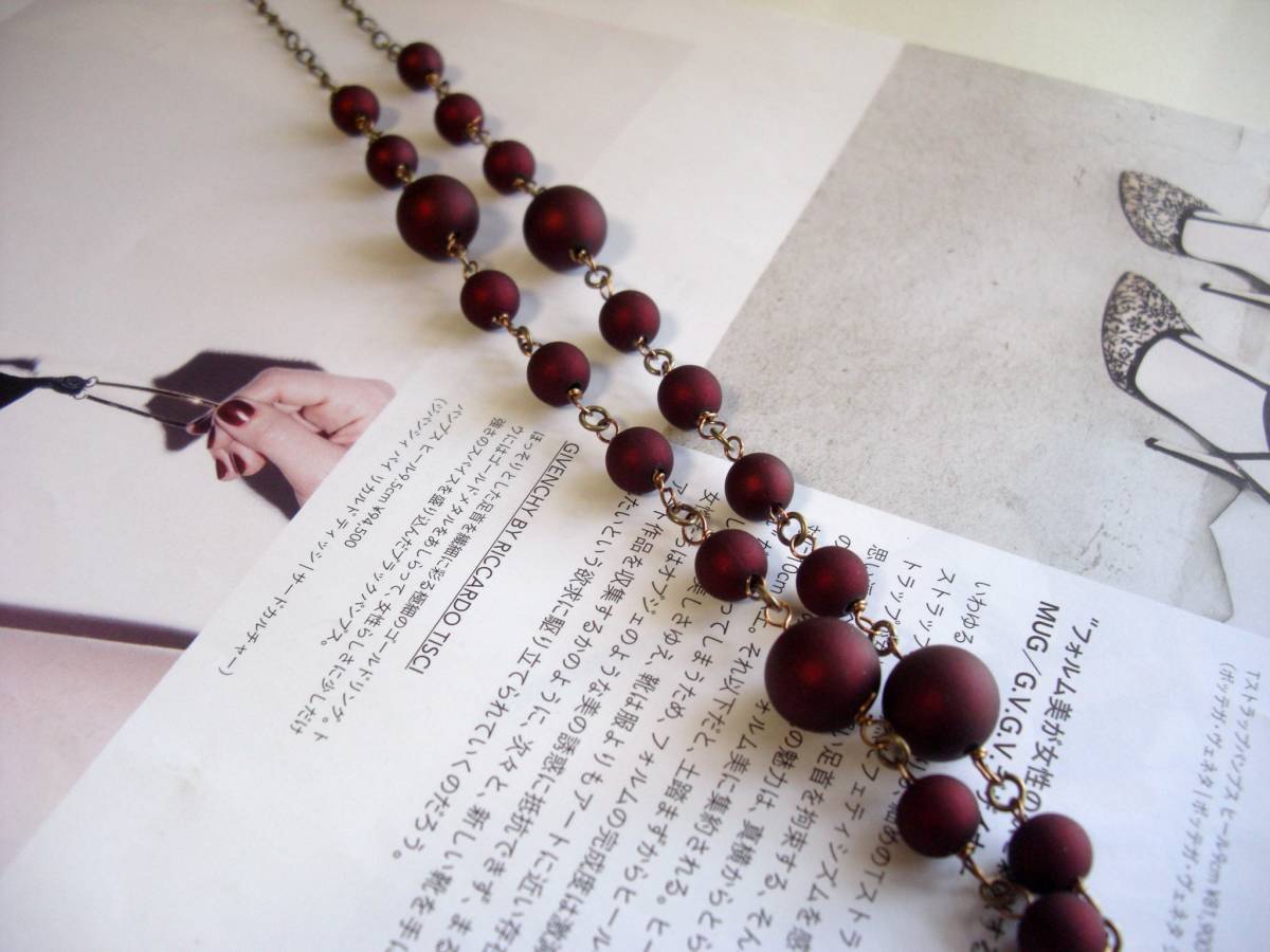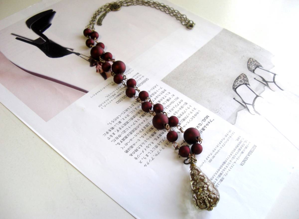 アンジーの宝石箱・・シリーズです♪ボルドー色の首飾り・・シックな秋色の樹脂パールのネックレスです♪ボルドー色の樹脂パールにアンティークなデザインの樹脂ビーズを合わせてオリエンタルな表情です♪樹脂パールは12ミリ、7ミリ位の大きさ違い、トップの樹脂ビーズは3・5×1・5センチ位です♪長さは全長82センチ位で調節自由です♪トップは4・5センチ位です♪軽い素材なので色々なシーンで楽しんでいただけます♪お揃いのブ レスレットやイヤリングも出品しています♪♪シンプルでいつまでも着けられるデザインを考えて作りました!ハンドメイドをご理解頂いてノークレーム、 ノーリターンでお願いします