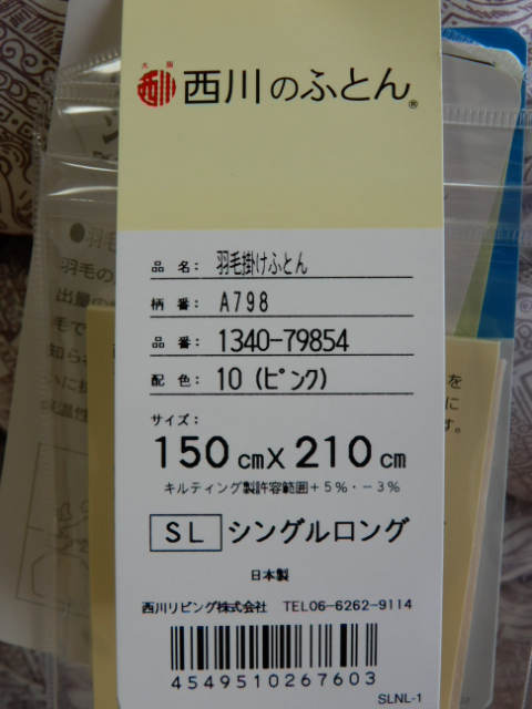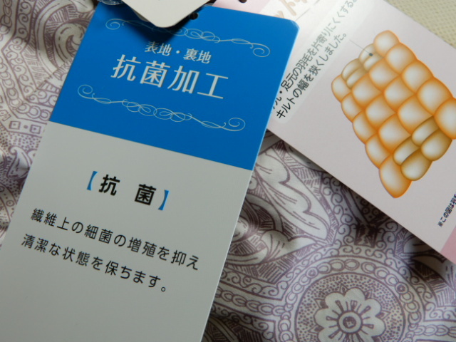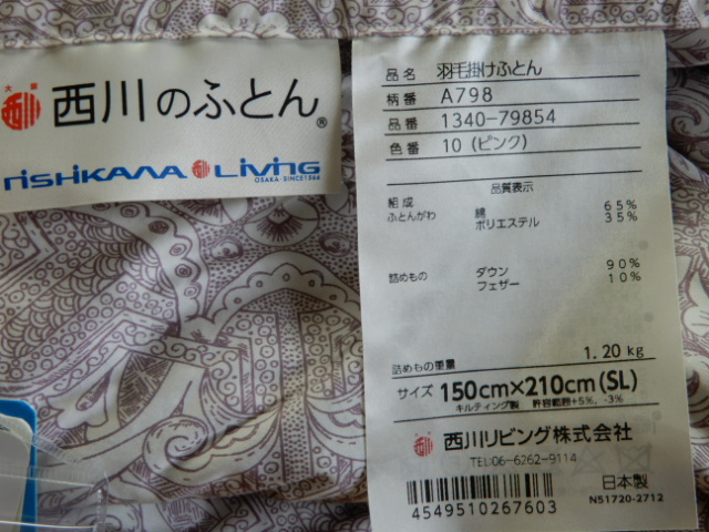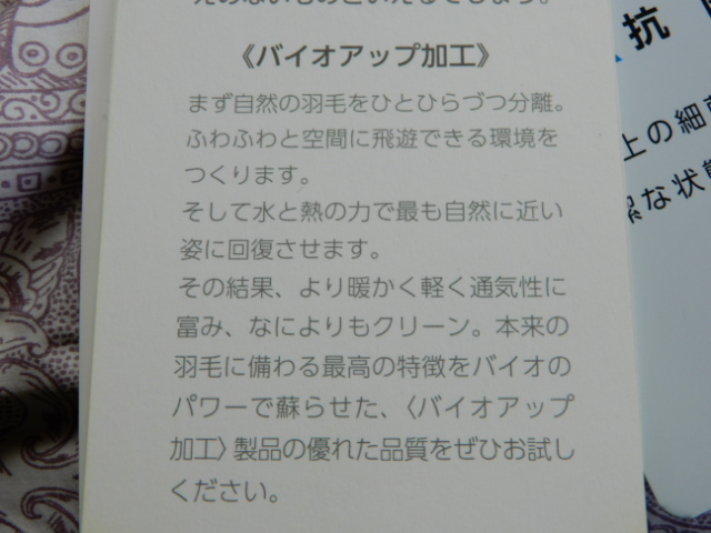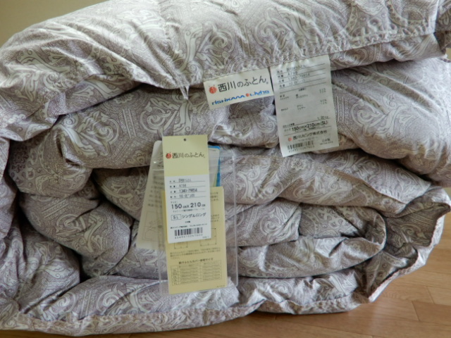 | 商品サイズ : 150×210cm キルティング製 許容範囲+5% -3% 材質 : ふとんがわ 綿65%ポリエステル35% 詰めもの ダウン90% フェザー10% 詰めもの重量 1.2kg 商品状態 : 新品・未使用 ・抗菌加工(表地・裏地) 繊維上の細菌の増殖を抑え清潔な状態を保ちます。 ・水と熱の力を活用した「バイオアップ加工」で、暖かく、軽く、クリーンなふとんに。 ・衿元フィットキルト (衿元・足元の羽毛を片寄りにくくする為、キルトの幅を狭くしています。) ・日本製 西川リビング株式会社 | |||