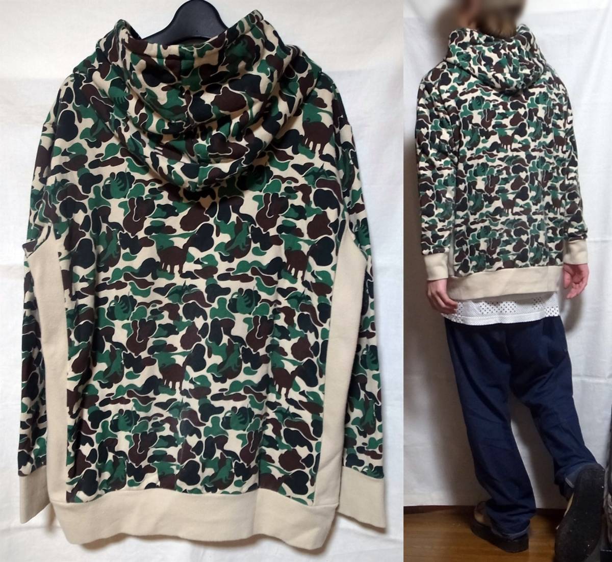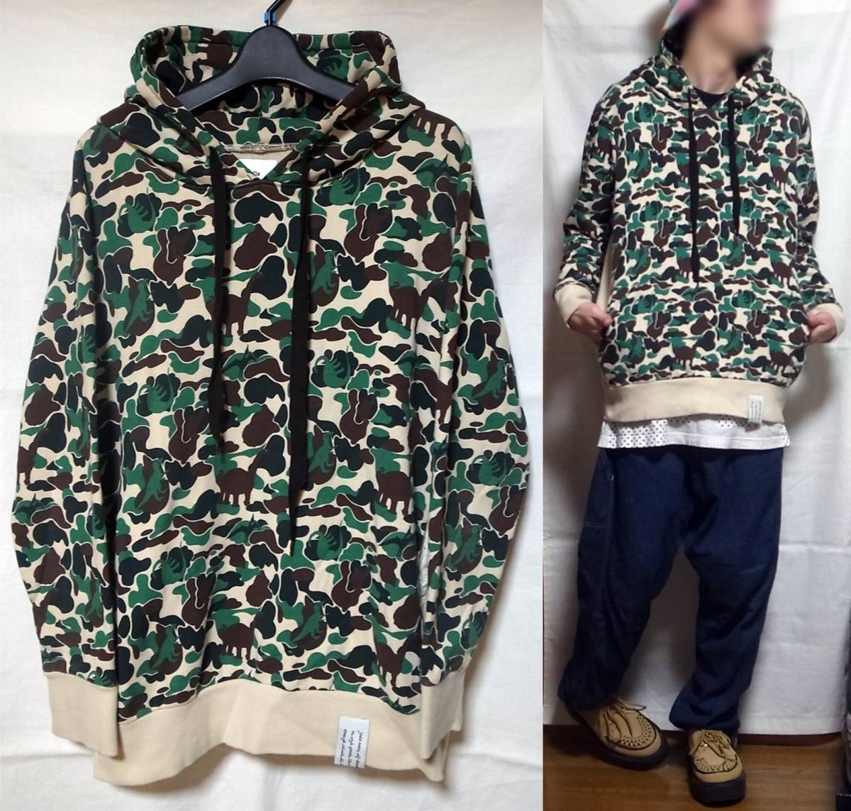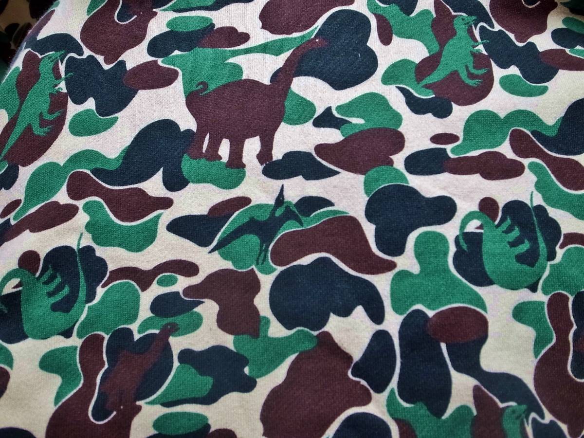 恐竜のシルエットをカモフラ柄に落とし込んだ素晴らしいデザインセンスのパーカーです。サイズも一番需要のあるサイズかと思います。