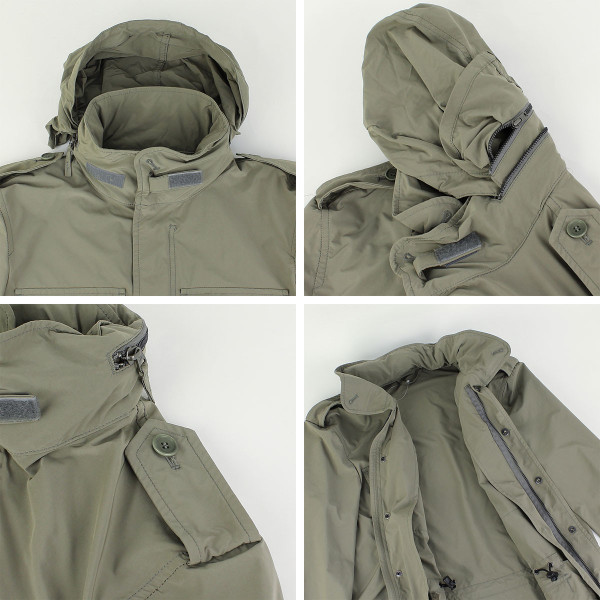 腰と裾にはドローコードが配されているので絞ることでシルエットの調節ができ、ダブルジップとボタンの二重仕立ての前立て、襟にはフードが収納されているなど実用的なディテールもポイントです