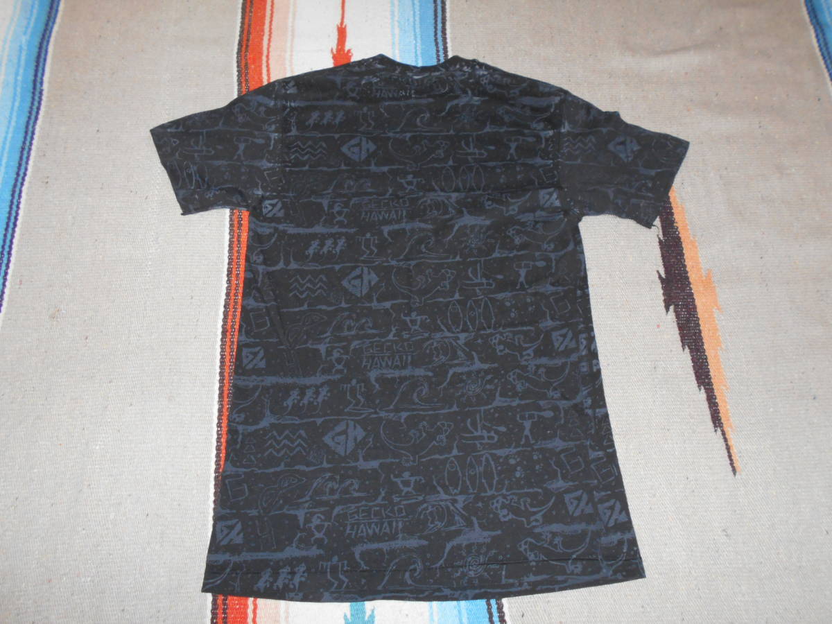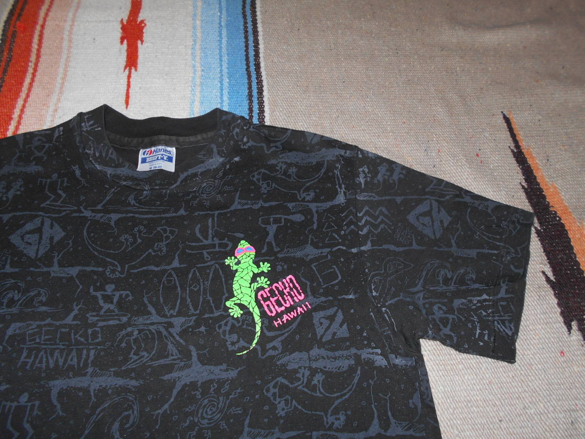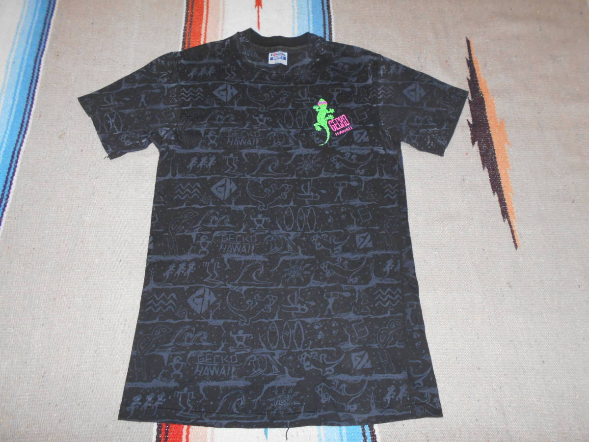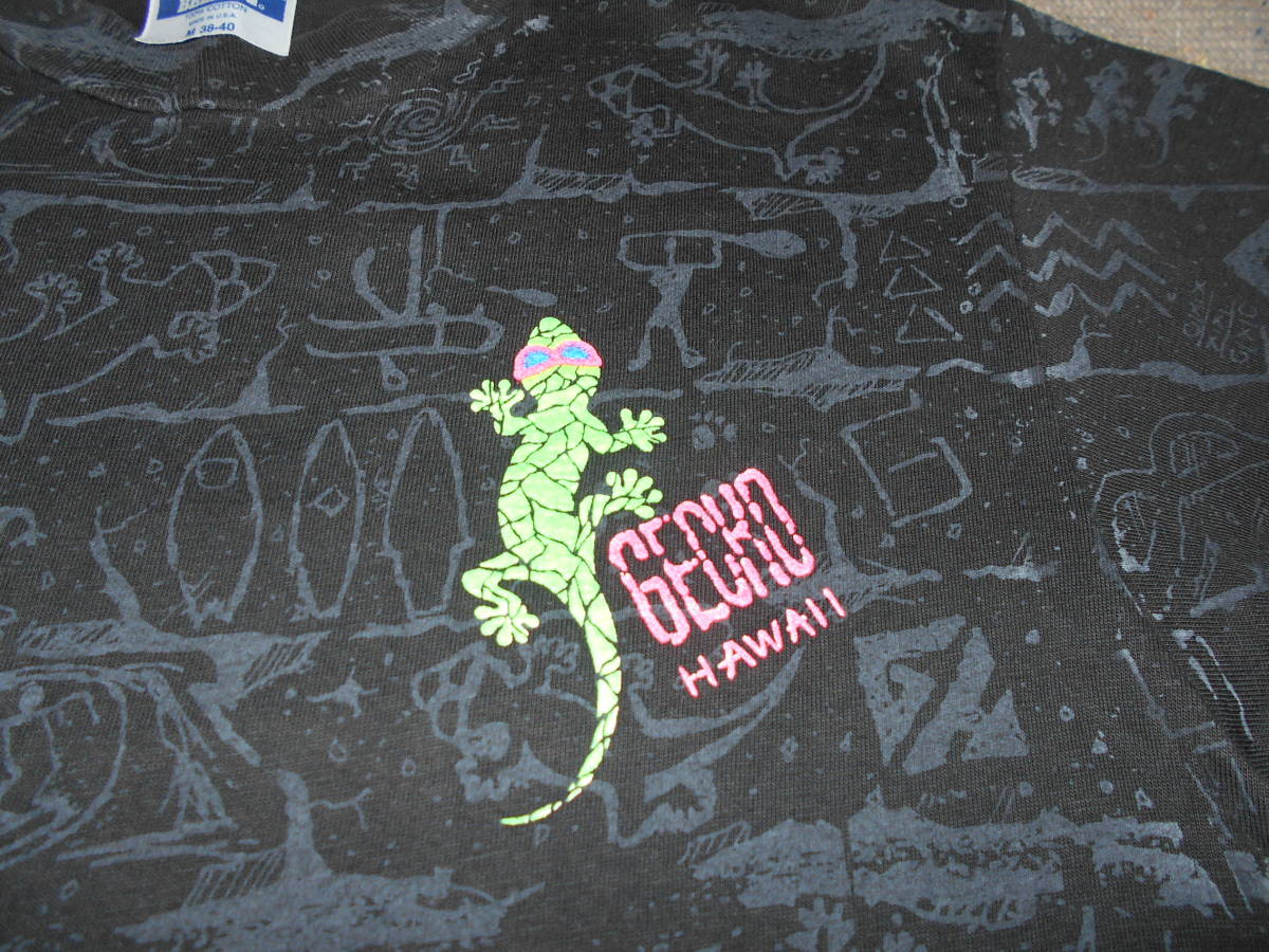 1980年代 HAWAII オールドサーフアイテムらしい、サーフボードやウェイブのマルチグラフィックに ネオンカラーの GECKO エンブレムが極めて良い感じ