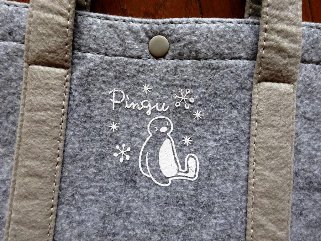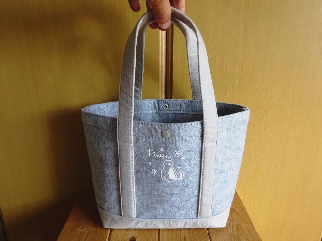◎◎★★★1点限りの限定です。。。即決大歓迎♪  自然な風合いのフエルト素材、落ち着き感じるキャラクターバック♪・・・「2色グレー色フエルト製 & 口元ホック付◆ ピングー PINGU キャラクター柄トートバッグ & ランチバッグ」(未使用新品)をお譲り致します。