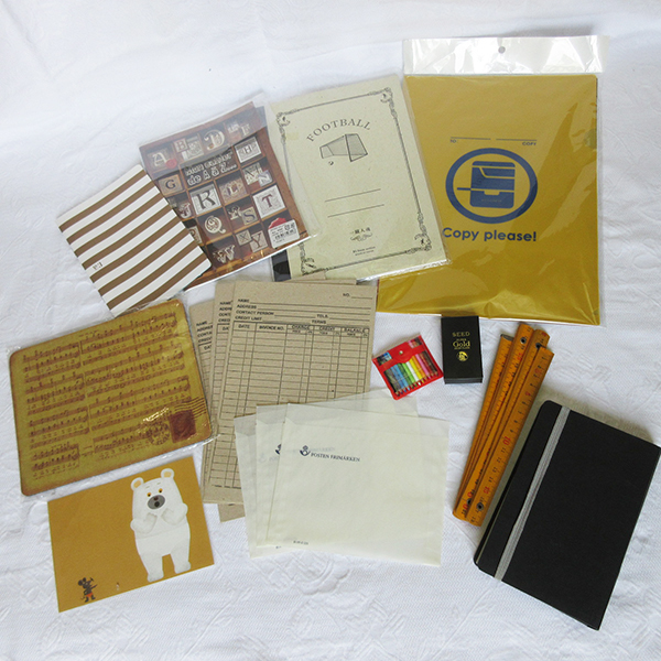 | ●文房具セット ・ノート:未使用/3冊 ・マウスパット:未使用/1個(楽譜柄) ・クリアファイル:未使用/5枚(ホワイトボードマーカーで書いて消すことができます) ・封筒:未使用/2種類(3枚ずつ) ・消しゴム:未使用/1個 ・色鉛筆:未使用/1個 ・スケール:未使用/1個(経年によるサビ・汚れがあります) ・ケース付きメモ帳:未使用/1札 ・ポストカード:1枚 未使用品なので末永くご愛用いただけるかと思います。 ※バラ売り不可 | ||