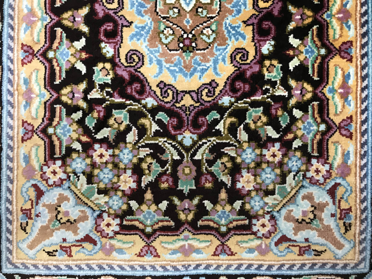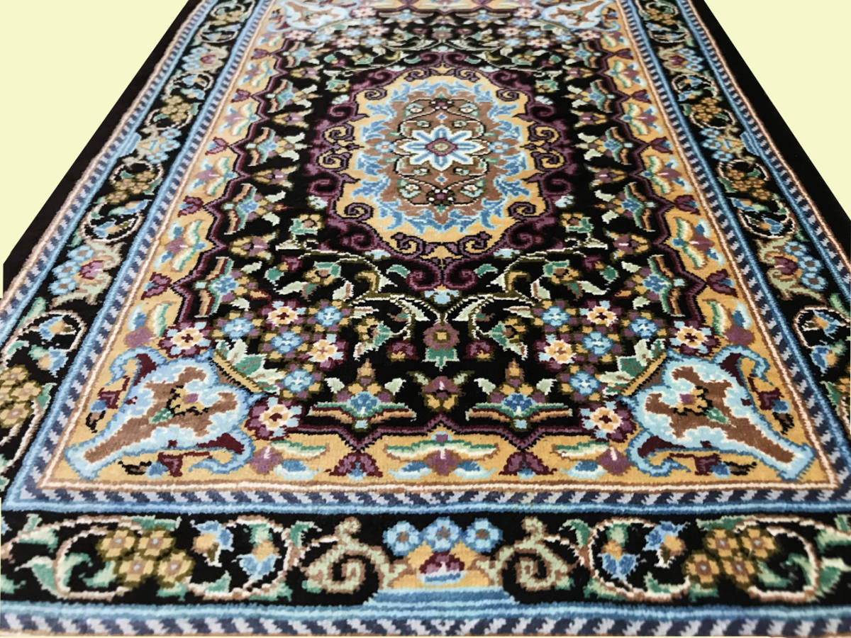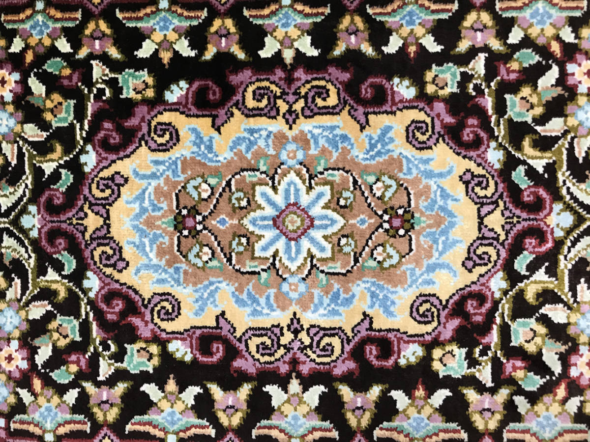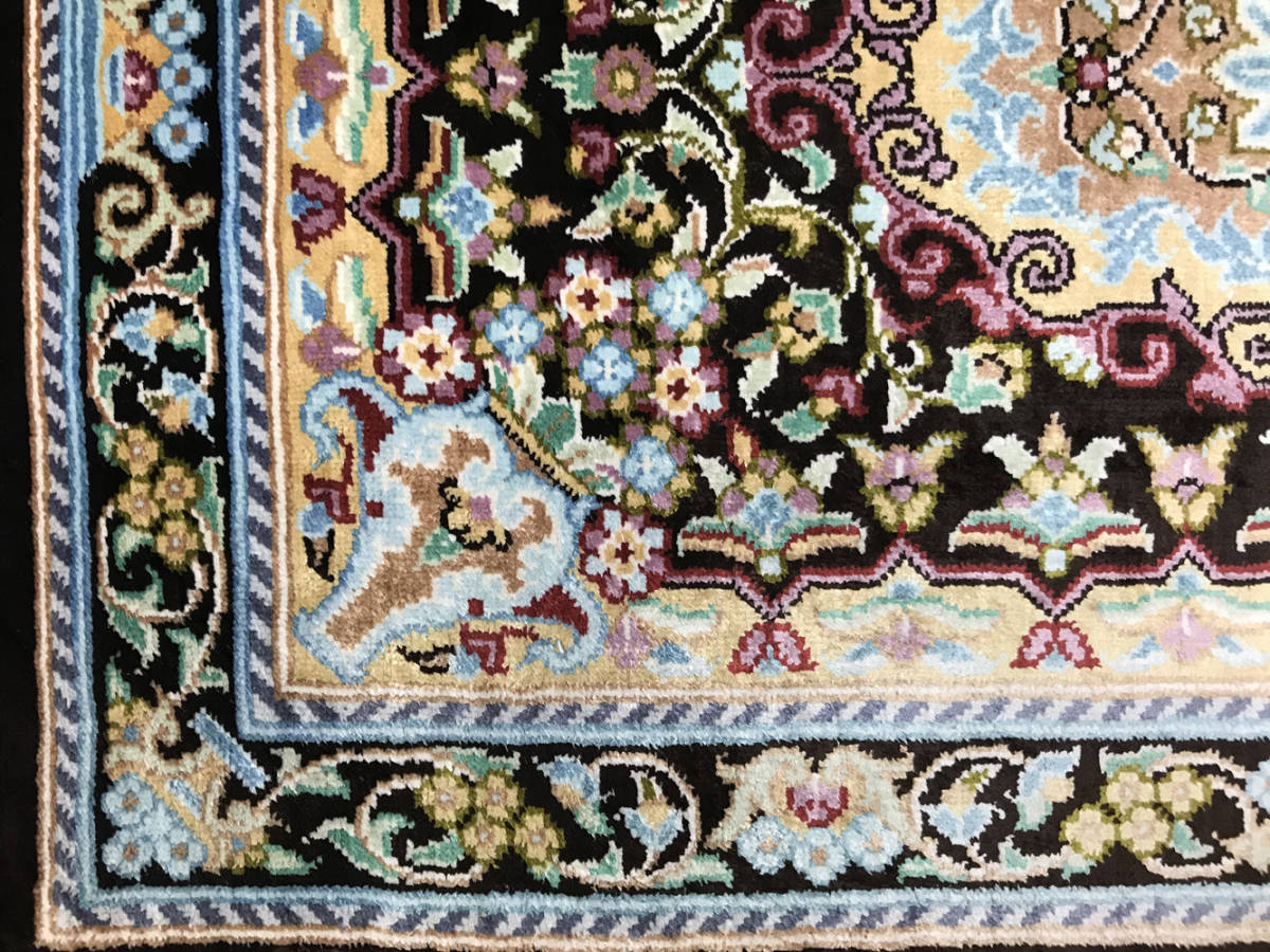 こちらの絨毯は、クム産の高級シルク100%の手織り絨毯です。