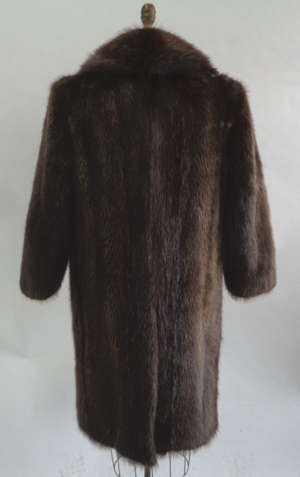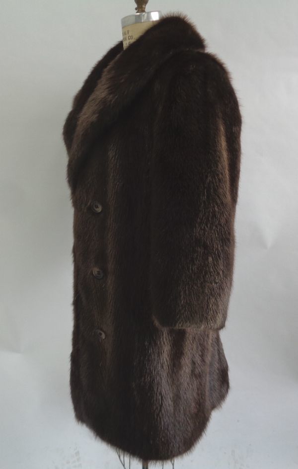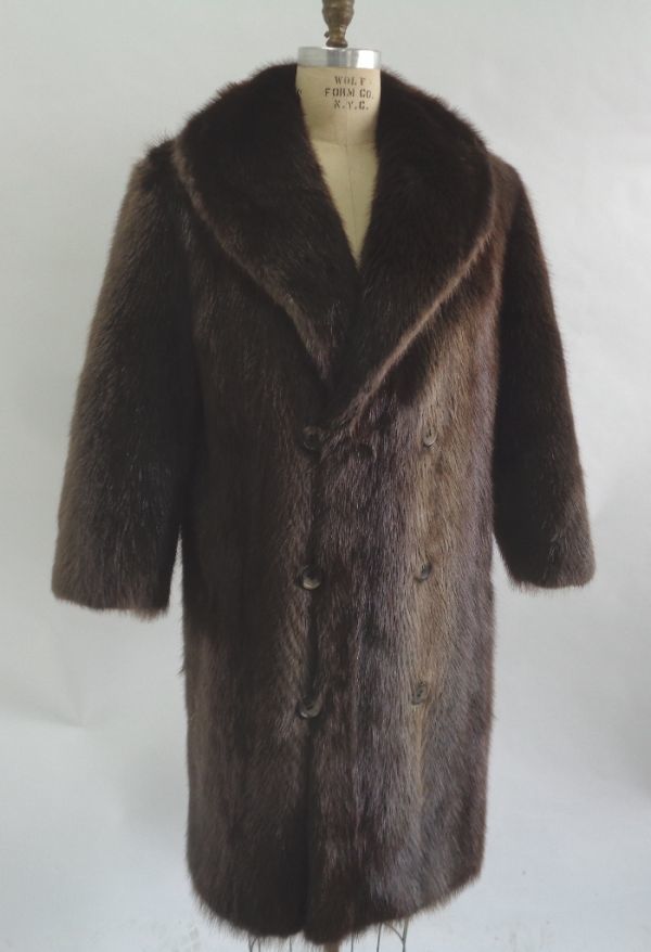 スタイリッシュなブラウン・ビーバー毛皮ファー・コート。つやのある滑らかな毛並み。ショールカラー。ボタン留め。ダブルブレスト・ボタンデザイン。