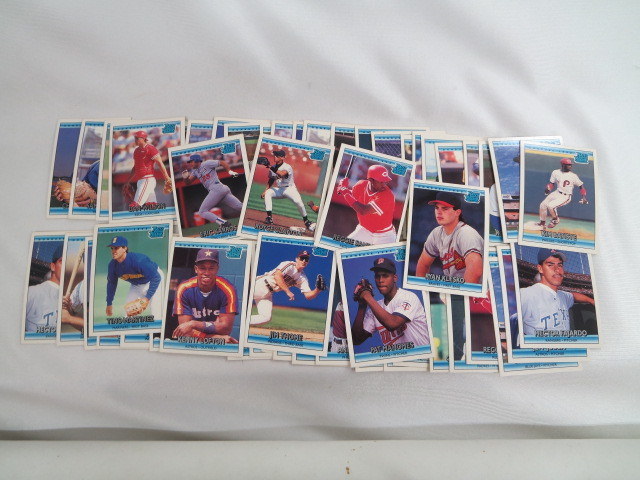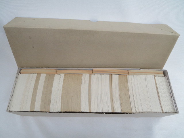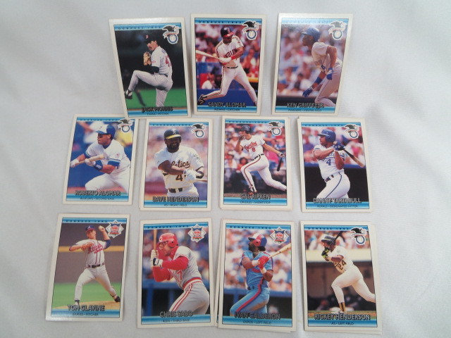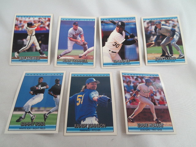 以前アメリカで購入しました MLB・スコア・1991・シングルカード です。パックをばらしたシングルカードになります。(合計枚数は850枚以上です。ダブり等色々有りです。写真を参考にして下さい。)レギュラーカード=約750枚・レイテッドルーキーカード=56枚・オールスター・ハイライトカード=26枚・その他(チェックリスト・マーリンズ・ロッキーズロゴカード)=15枚になります。レイテッドルーキーカードにはチッパージョーンズ、ドラフトピックアップカードにはティノマルティネス・エリックキャロス・ジムトーミー・ケニーロフトンが含まれています。暗室保管ですが購入は約30年以上前と古い物ですのでご了承の上、入札をお願いします。トラブル防止の為、神経質な方は入札をご遠慮下さい。たくさんの入札をお待ちしています。発送は定形外郵便(簡易包装・全国一律¥1350)・郵パック着払い(箱入り・持ち込み料金・60サイズ)のいずれかになります。他にも出品していますがカードは重量がありますので複数落札・配達場所によっては郵パック着払をお薦めします。(コンプリートセット2ヶ=60サイズ・3ケ以上は80サイズになります。)ノークレーム、ノーリターンでお願いします。