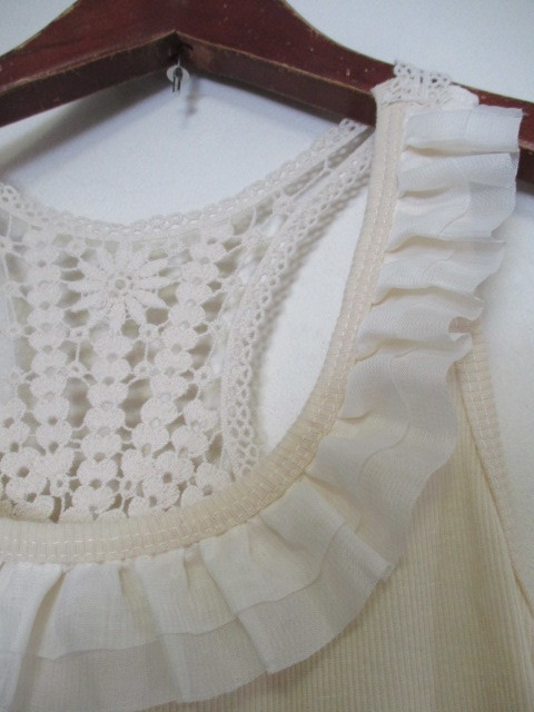 商品紹介 | 背中後ろにレース、胸周りにチュールレースが付いた タンクトップです。 本体はきなりのリブ素材です。 《素材》 記載がなく、不明 |
