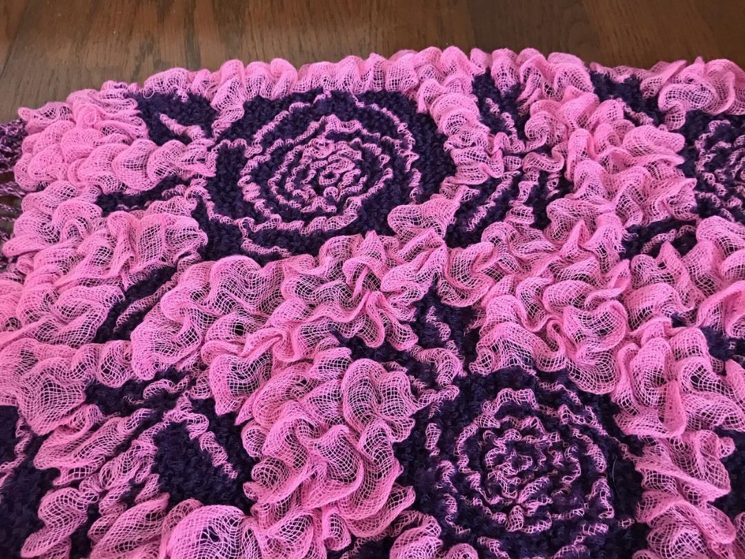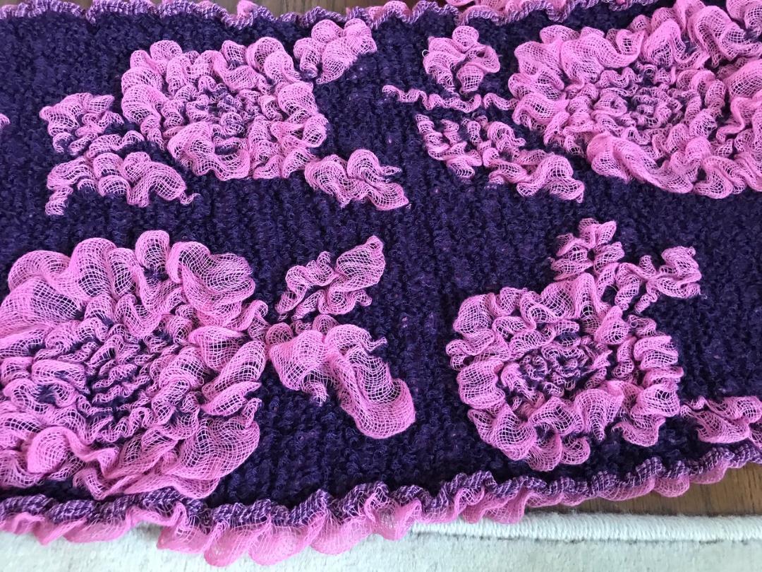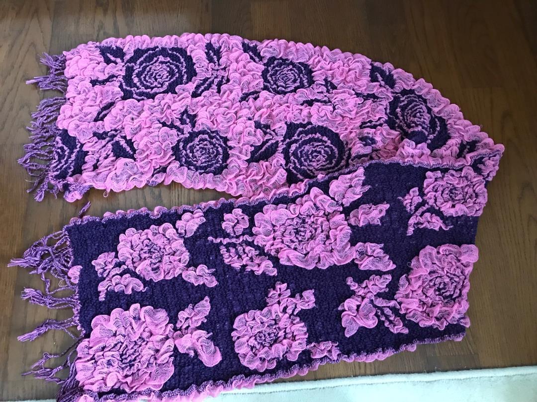 紫とピンクと花柄になっています。ピンクがガーゼのような生地で立体になっています。伸び縮みする素材です。平置きで30センチ×180センチ 素人寸法です。