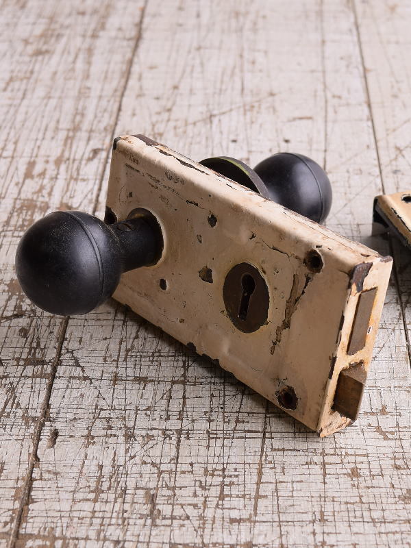 イギリスの蚤の市で見つけてきたアンティークラッチ&ベイクライトドアノブ セットです。 受け金具(面付けストライク)が付いています。 ドアノブの大きさが丁度握りやすいサイズです。 使い込まれた風合いがとても素敵です。 大きなダメージ無くコンディション良好です。リノベーションや、 ショップドアの金具にご利用ください