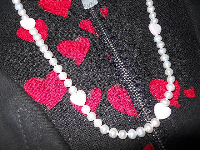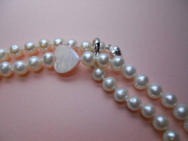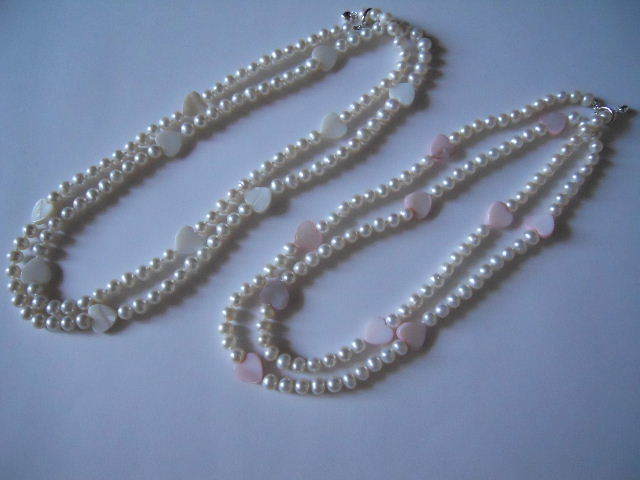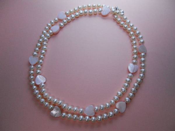 一重で内周約88cm、2重で内周約42cm、淡水真珠6.5~6mm珠、ピンクシェルハート10個、クラスプクリッカーSV925、エンドチャームハートSV、