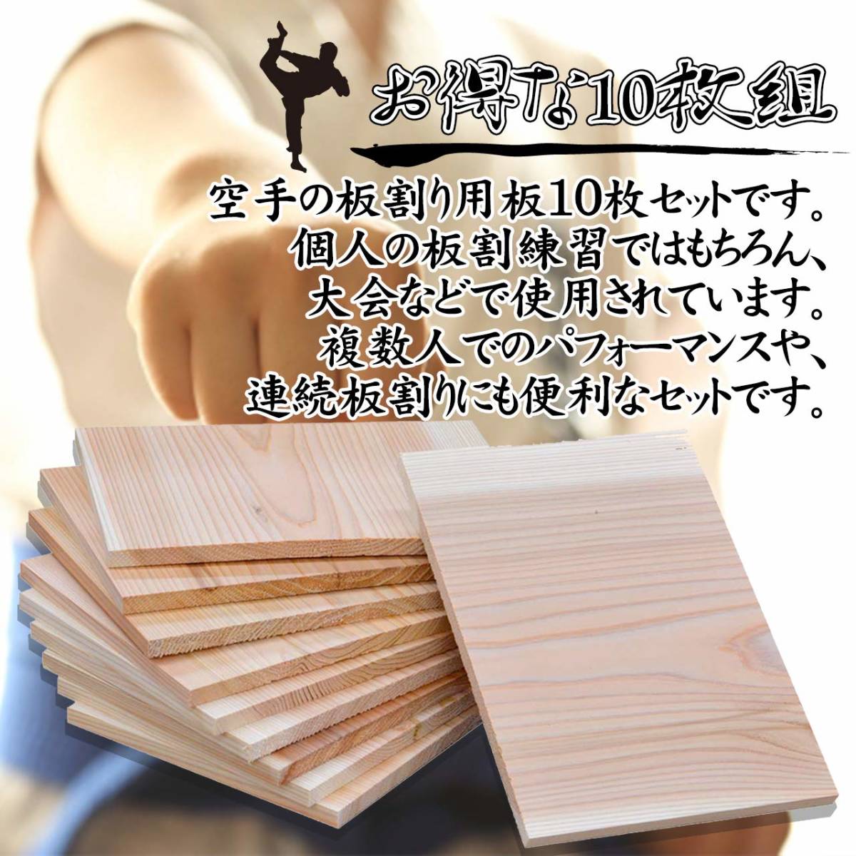 試割板10枚セット:空手の演武や練習用の、板割り用板10枚セットです。個人の板割練習ではもちろん、デモンストレーションや演武大会などで使用されています。複数人でのパフォーマンスや、迫力のある連続板割りにも便利なセットです。