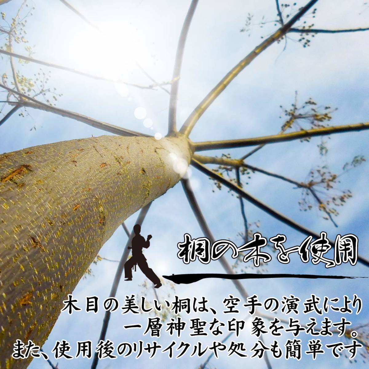 桐を使用:木目の美しい桐は、空手の演武により一層神聖な印象を与えます。また、使用した後のリサイクルや処分も簡単です。※木なので節目やソリが発生している場合もございます。また、トゲやささくれに十分注意してご使用ください。