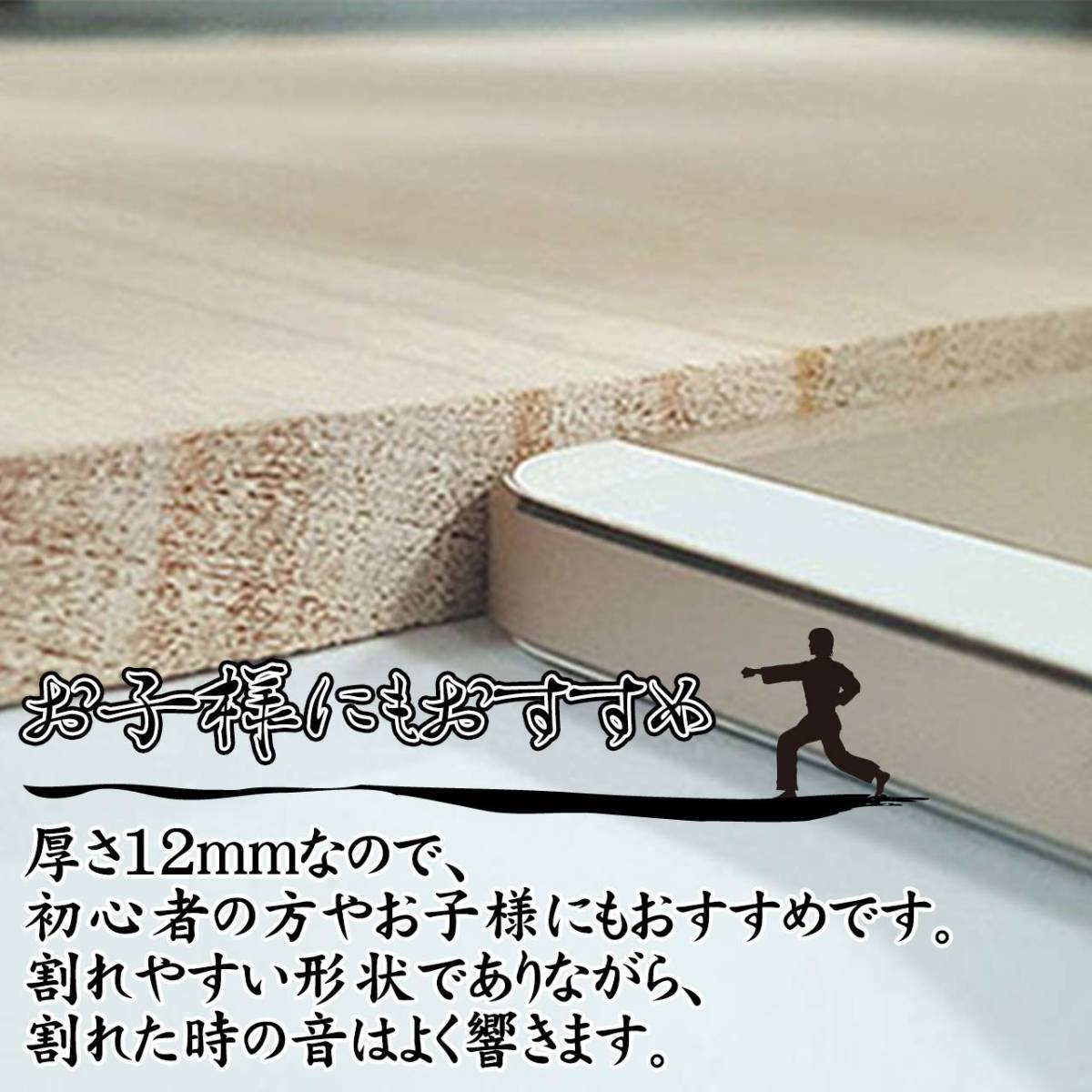 ジュニア空手にもおすすめ:厚さが12mmなので、初心者の方や子供の演武発表会にもおすすめです。割れやすい形状でありながら、割れた時の音はよく響きます。割った時の爽快感は、モチベーションの維持にも繋がります。