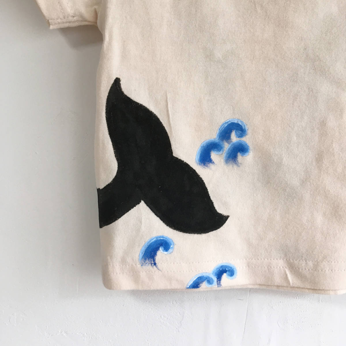 ご覧いただきありがとうございます。 一つ一つ丁寧に手描きで絵付けし、筆跡やカスレなどがプリントTシャツとは一味ちがう手描きならではの味わいとなっております。 全面左裾から後ろにかけて海から跳ね上がシャチをおおきく一匹描いたTシャツ、シンプルデザインながら手描きにしかできない配置で描いたシャチは動物好きのお子さんに喜んでいただけるデザインです。 プレゼントにも喜ばれる一枚です。 カラー:ナチュラル サイズ: 120:身丈47㎝ 身幅35㎝ 肩幅32㎝ 袖丈14㎝ ※ 90サイズには肩部分に樹脂製のスナップボタンがつきますがそれ以外のサイズにはスナップボタンはつきません。 素材:綿100% Tシャツ素材について:5.6オンス 胴仕上げ 首リブはダブルステッチ しっかりふっくらとした生地のハイクオリティなTシャツ、繰り返しの洗濯にもよれないコシのあるリブはTシャツ好きさんには納得していただける素材のTシャツを使用しております。 その他別のボディカラーやレディースサイズ、メンズサイズ、長袖素材、名前入れなどにも対応できますのでお気軽にご相談下さい。 | |||