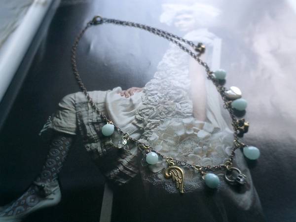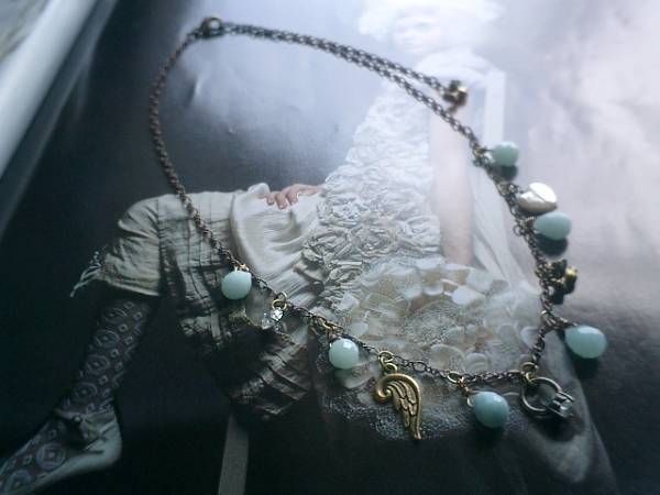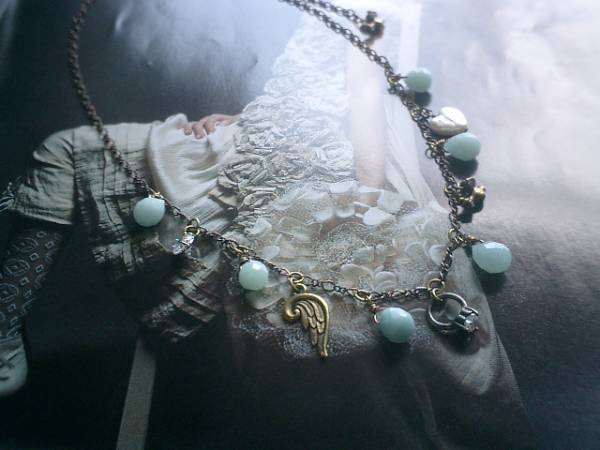 物語を紡いで・・シリーズです♪キュートなアマゾナイトのネックレスです♪シックなグレーがかった水色のアマゾナイトは9×7ミリ位のドロップカットです♪6ミリのジルコニアやジルコニアのドールリングや小鳥さんのチャームや9ミリの淡水パールのハートを合わせてひっそりロマンチックしています♪長さは全長55センチ位で調節自由です♪す♪チョーカー風に着けたりブレスにしても可愛いです♪ノスタルジックな表情です♪シンプルで飽きのこないいつまでも着けられるデザインを考えて作りました!お揃いのイヤリングやブレスレット、同じテーマの作品も出品しています♪ハンドメイドをご理解頂いてノークレーム、ノーリターンでお願いします