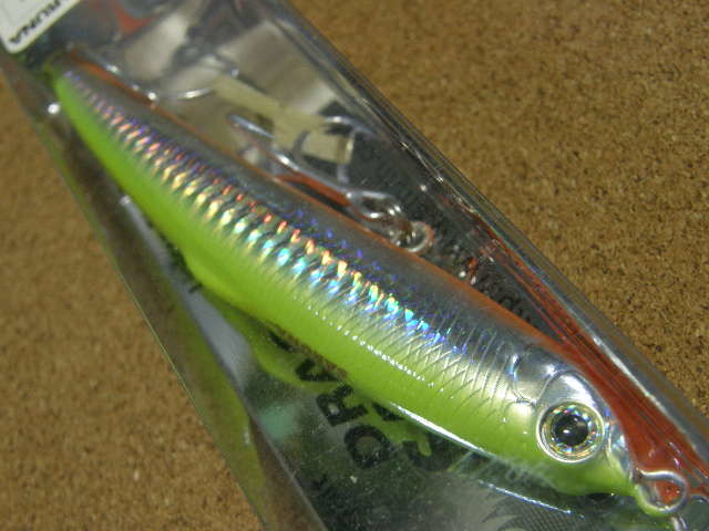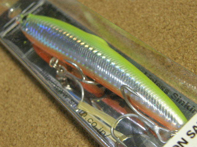 ●アクション・・・リトリーブ時はロールアクションがメインとなりますが、リトリーブ時にジャークを加える事でよりイレギュラーなキレのあるスライドが発生します。また、その合い間に発生する「間」に瞬間的なロールを伴うフォールをし、よろめくベイトの演出と共に喰わせのタイミングを誘発します。基本的にはリトリーブにショートやロングなどの多彩なジャークを織り交ぜてお使いいただくのがお勧めです。また、フォールをメインにした時は、時折ジャークを入れる事も好結果に繋がります。