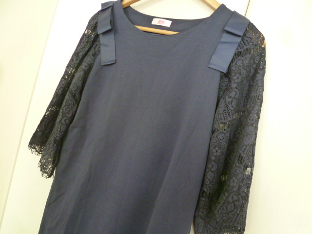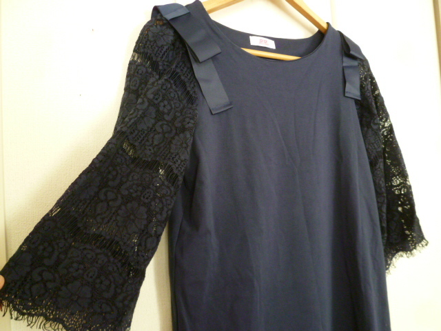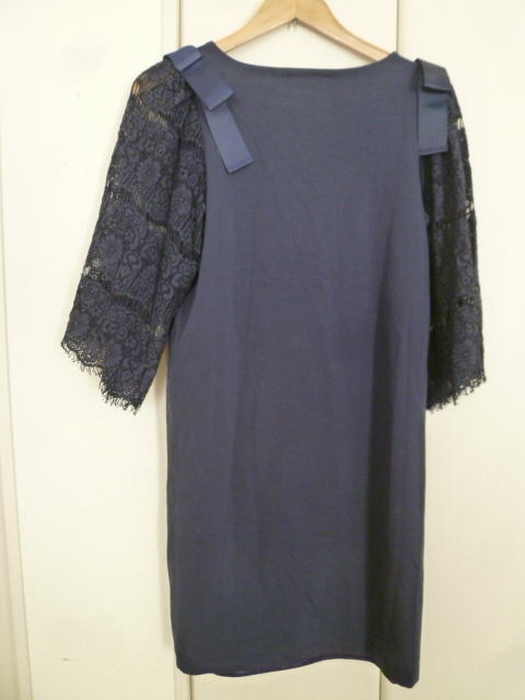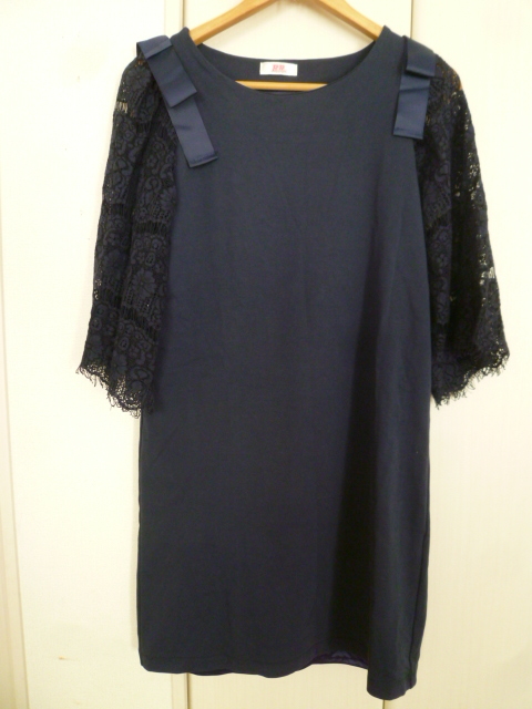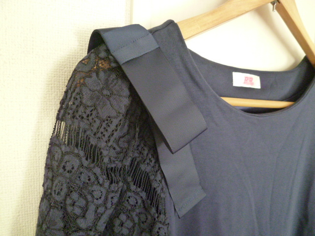 RyuRyu/リュリュ△紺袖レースフレア袖肩リボンフォーマルワンピースM/結婚式パーティーお呼ばれ二次会ネイビーベルーナ膝丈きれいめ△217