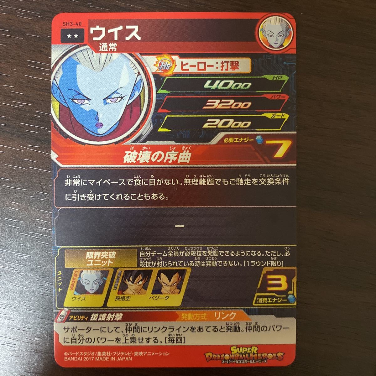 SH3弾レア/ ウイス(通常)/ SH3-40/ 技:破壊の序曲/ スーパードラゴンボールヒーローズ/ レアリティ:☆☆/ 2017 BANDAI
