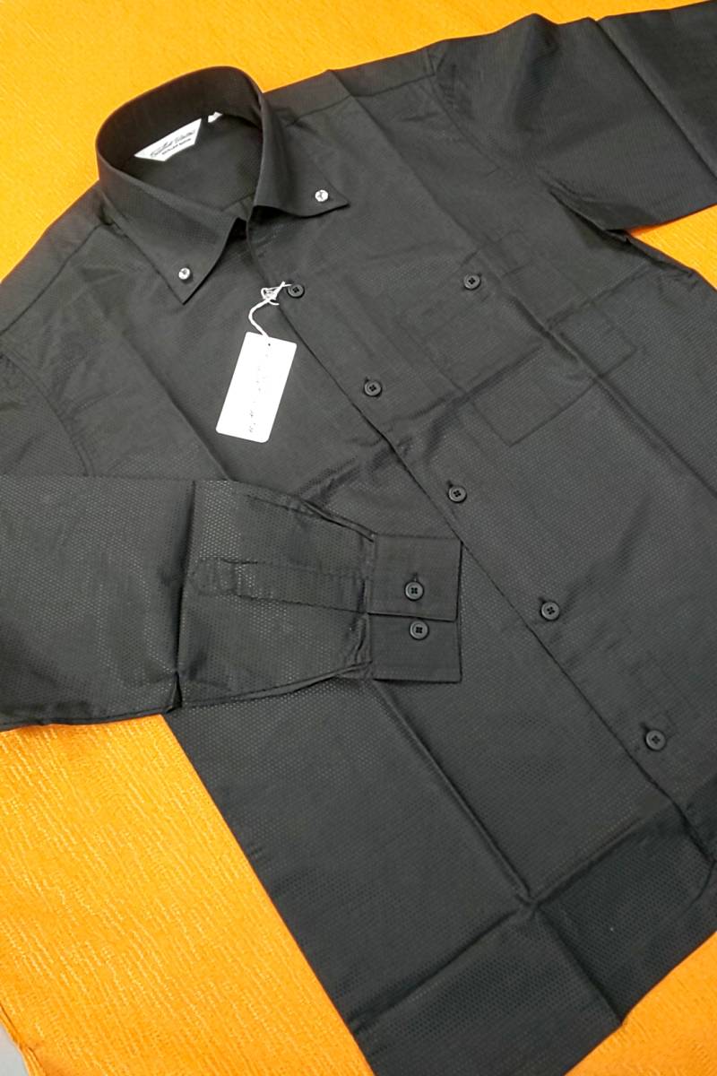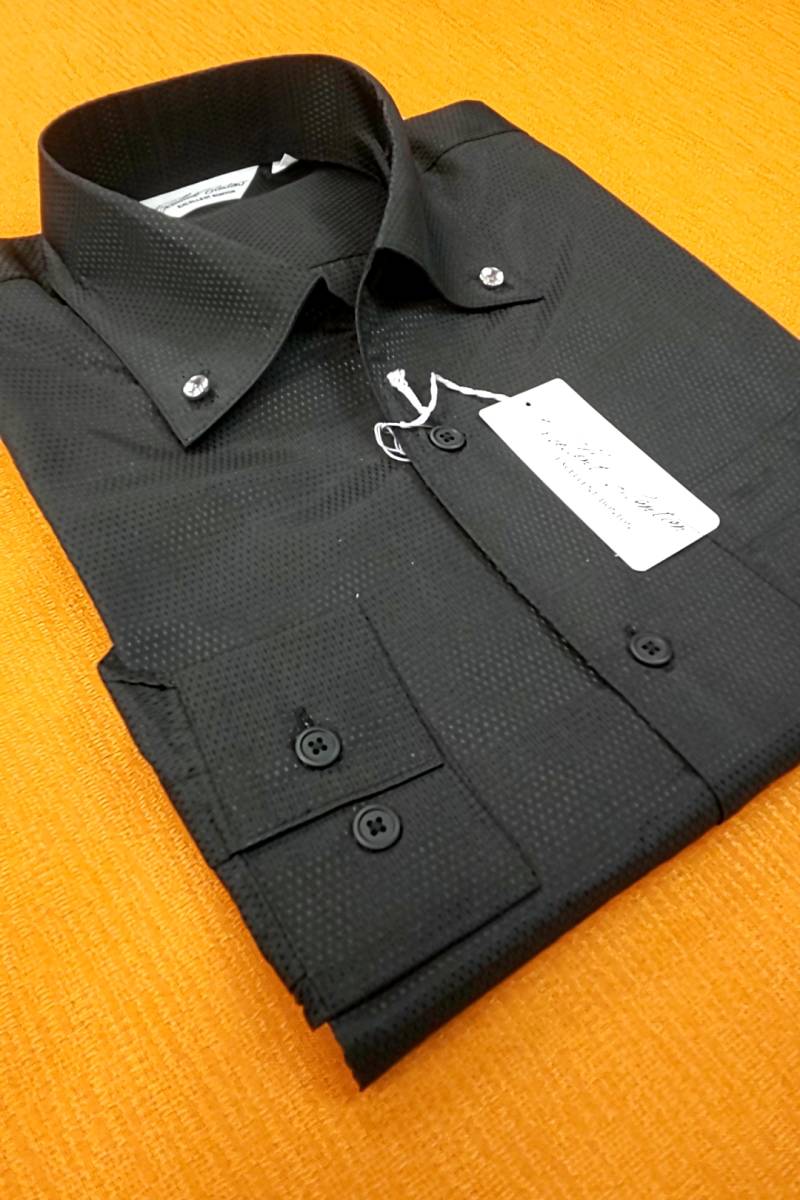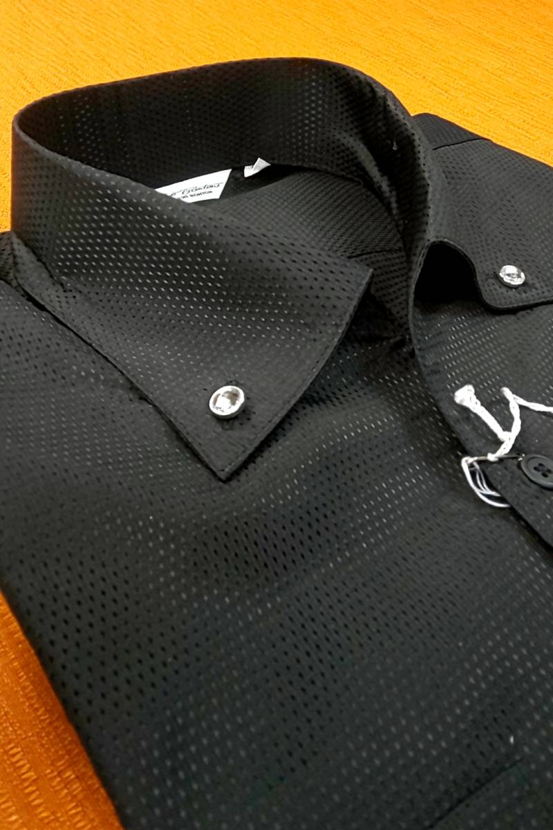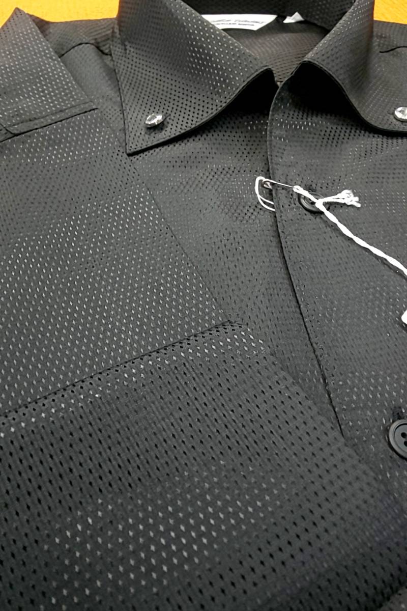 黒地に光沢ある黒での細かなジャガード織り柄、衿のラインストーンボタンなどインパクトあるスタイリッシュな商品です。