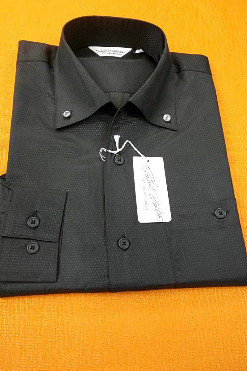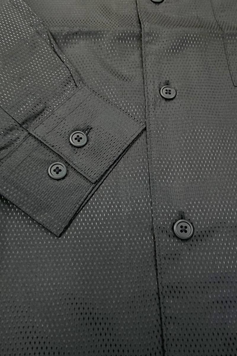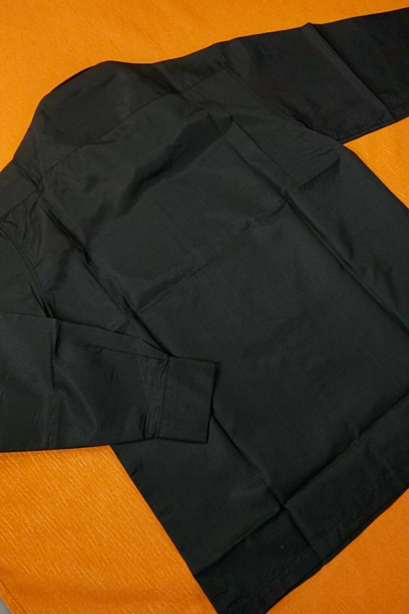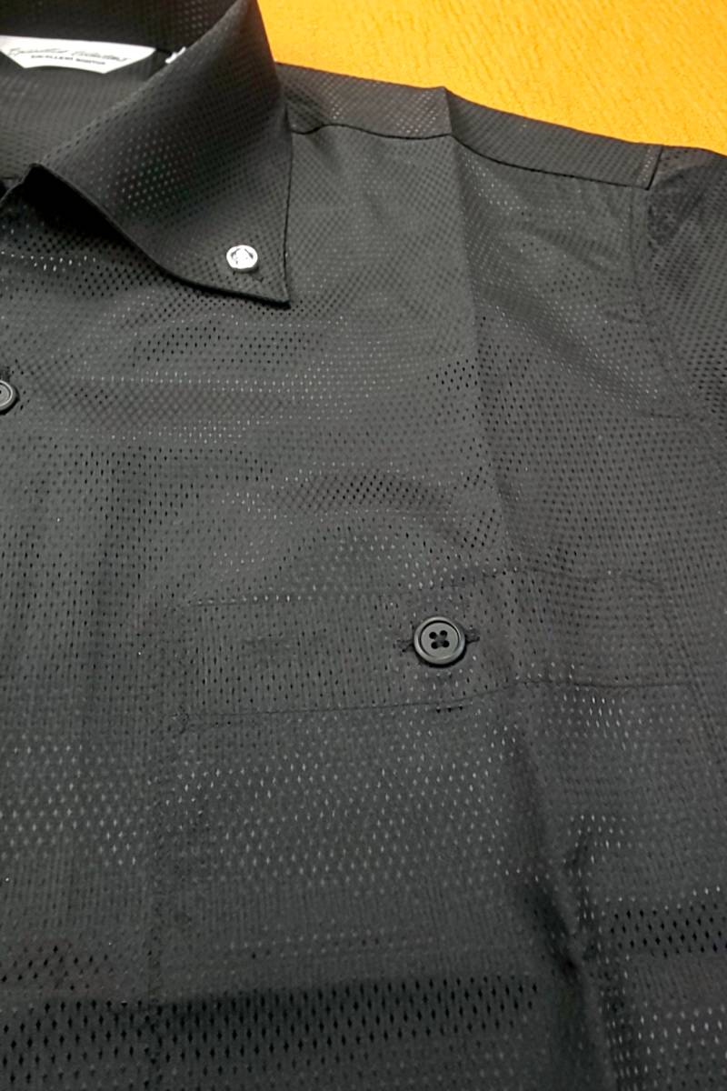 黒地に光沢ある黒での細かなジャガード織り柄、衿のラインストーンボタンなどインパクトあるスタイリッシュな商品です。