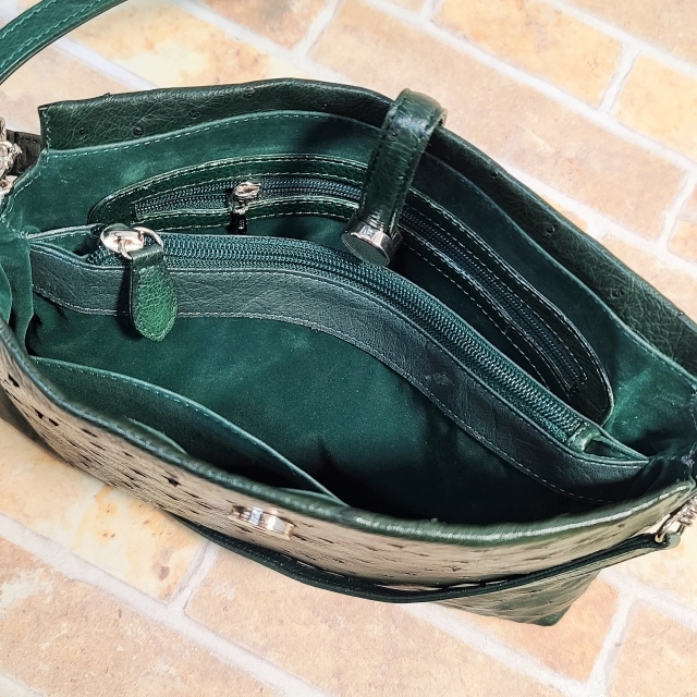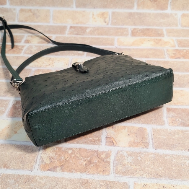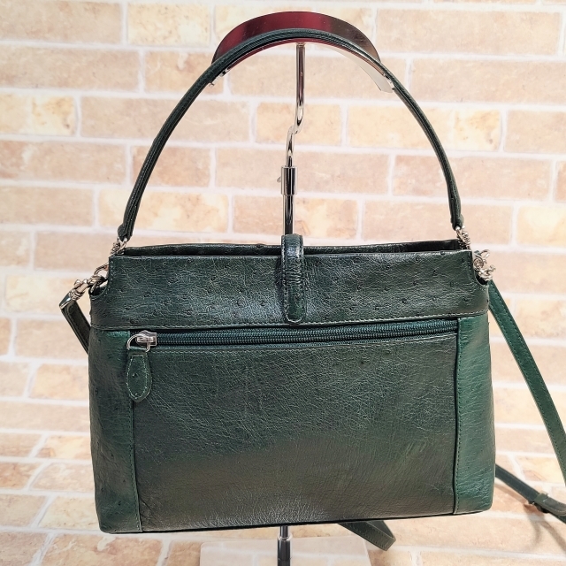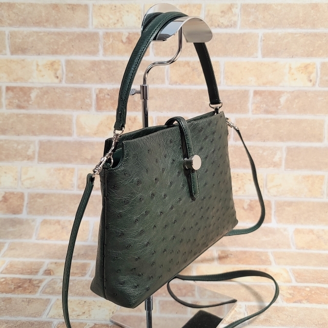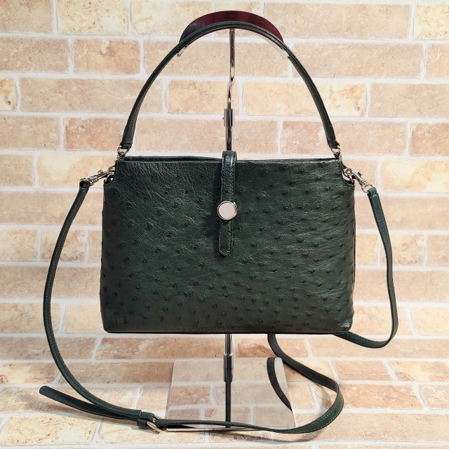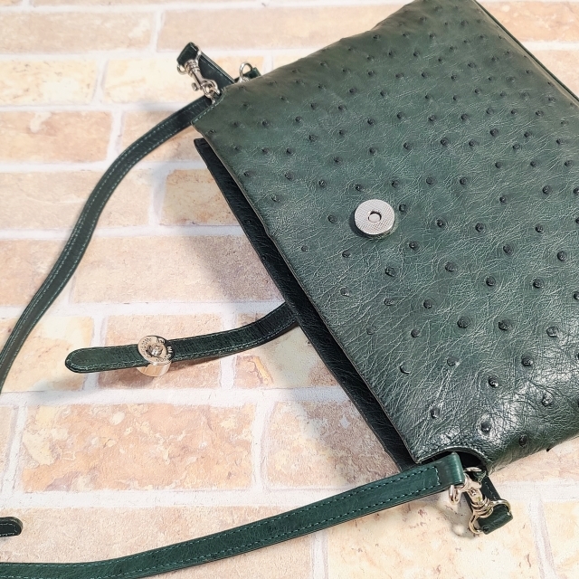 美品 オーストリッチレザー 2WAY ショルダーバッグ 小ぶり グリーン 収納多 自立OK | |