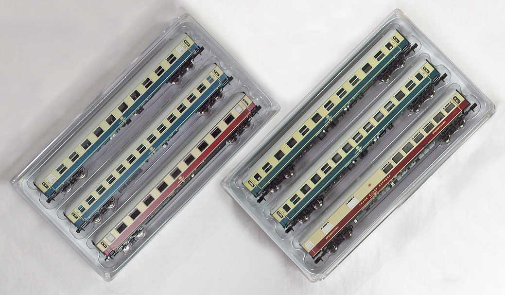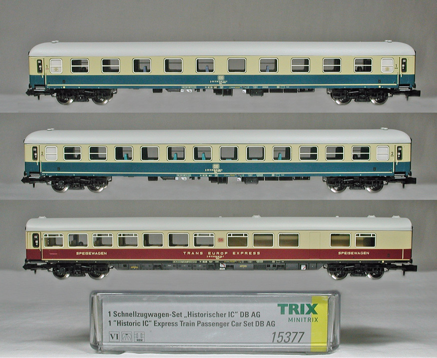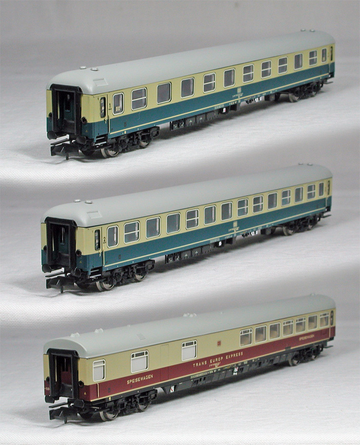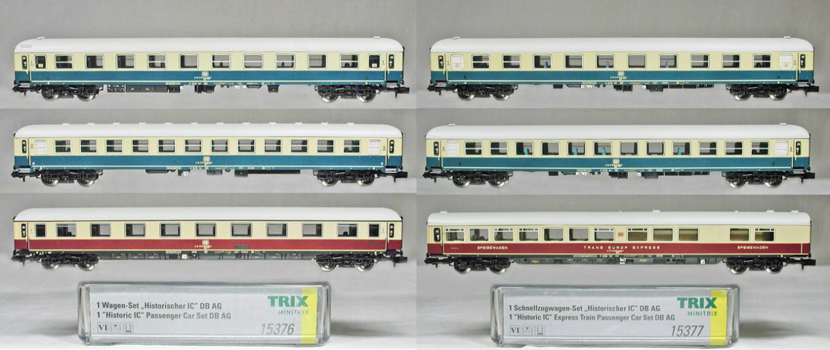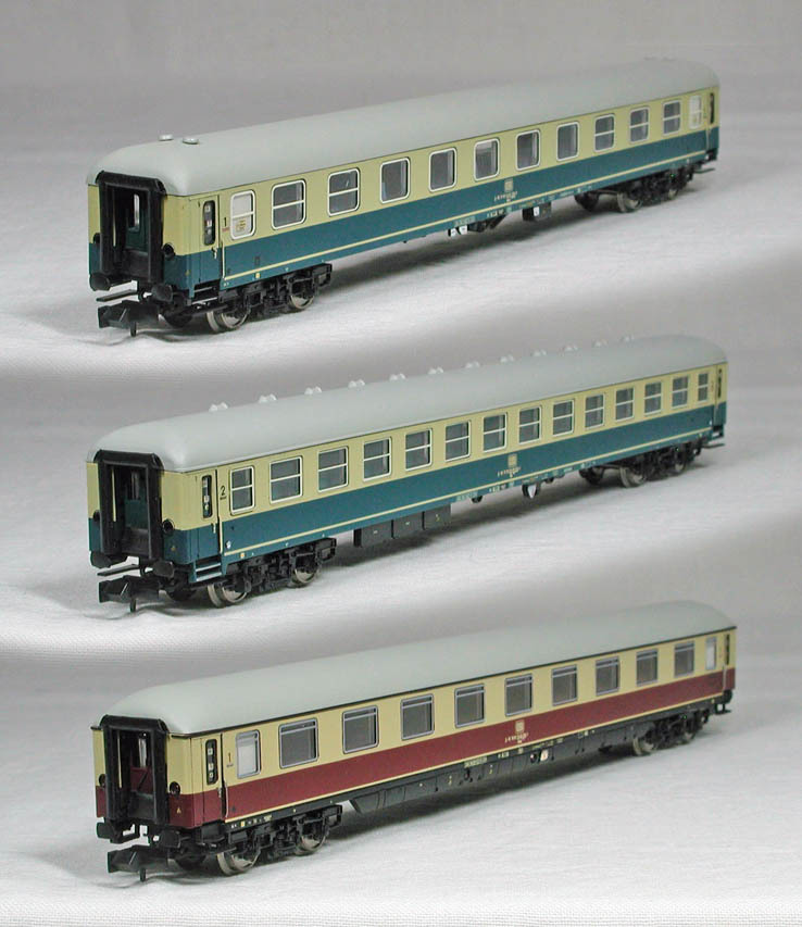 その編成は、往時のインターシティーの様に以下に成ってました。 機関車 + 2等車(タルキス) x 3 + 1等車x 2 + 食堂車 + 1等車 x 2 機関車:BR103電機 or BR120電機 ただし、実際の運用では、専用客車では無い通常客車に変わることも多々有ったようです。 このモデルは、歴史的インターシティー列車2410号用の旧塗装風に化粧させた専用客車のフル編成での装いと成ってます。 この商品は、基本Iの3輌セット1等客車(Aimz 261.5)、2等客車(Bm 235)、1等客車Avmz 111.0)と基本II3輌セット1等客車(Aimz 261.5)、2等客車(Bimz 264.7)、食堂車(WRmh 132.1)と増結用1等客車(Avmz 111.2)および、増結用2等車(Bm 235)の8輌フル編 成によって構成されてます。なお、製造は単年度だったようで既に絶版となってしまってます。また、増結用単品#15378と#15379の画像は後日追加予定です。 さらに、この列車の牽引機 MINITRIX #16341 DB-AG BR103.1型電気機関車(DB角ロゴ、TEE塗装、グレー裾)も別途出品してます。 |
