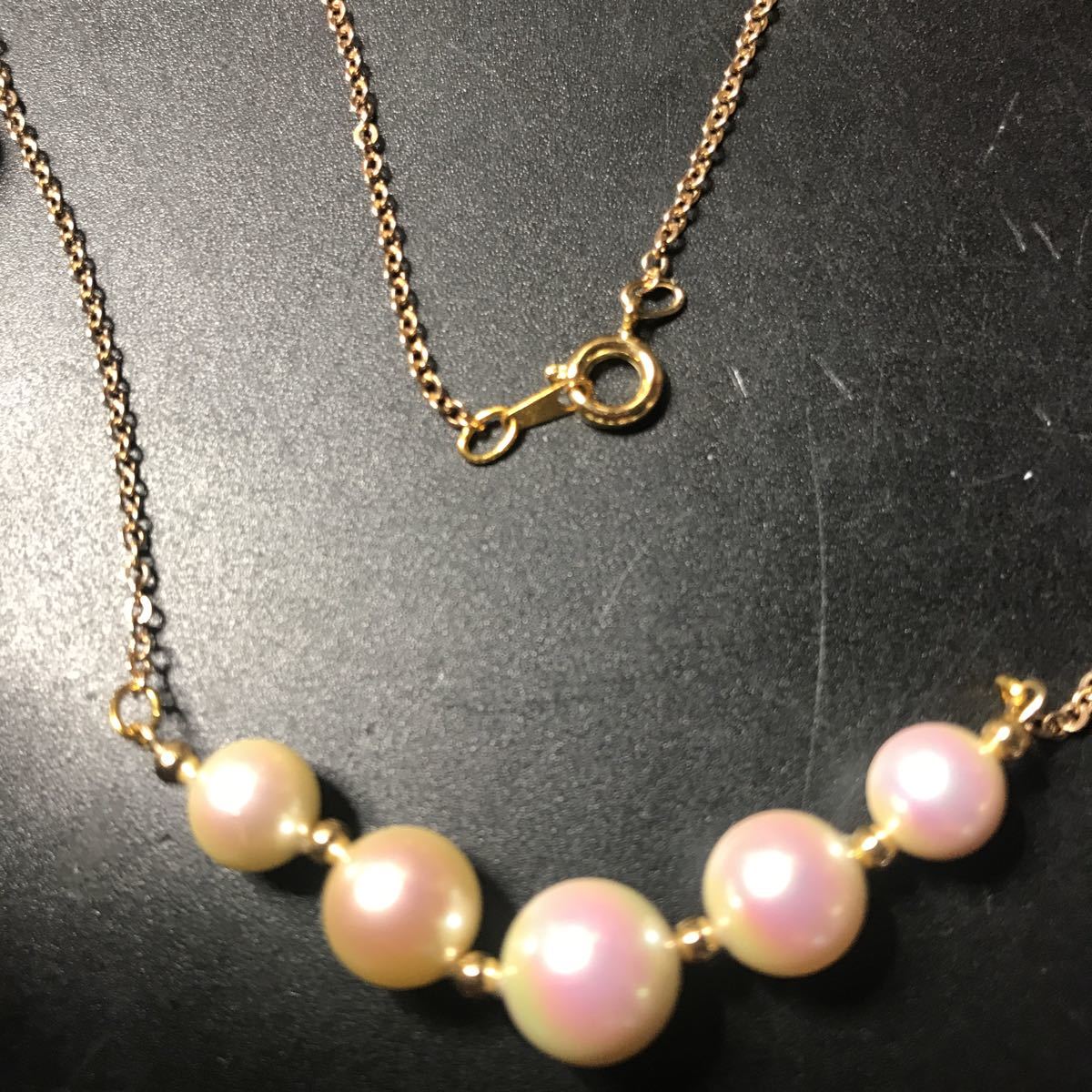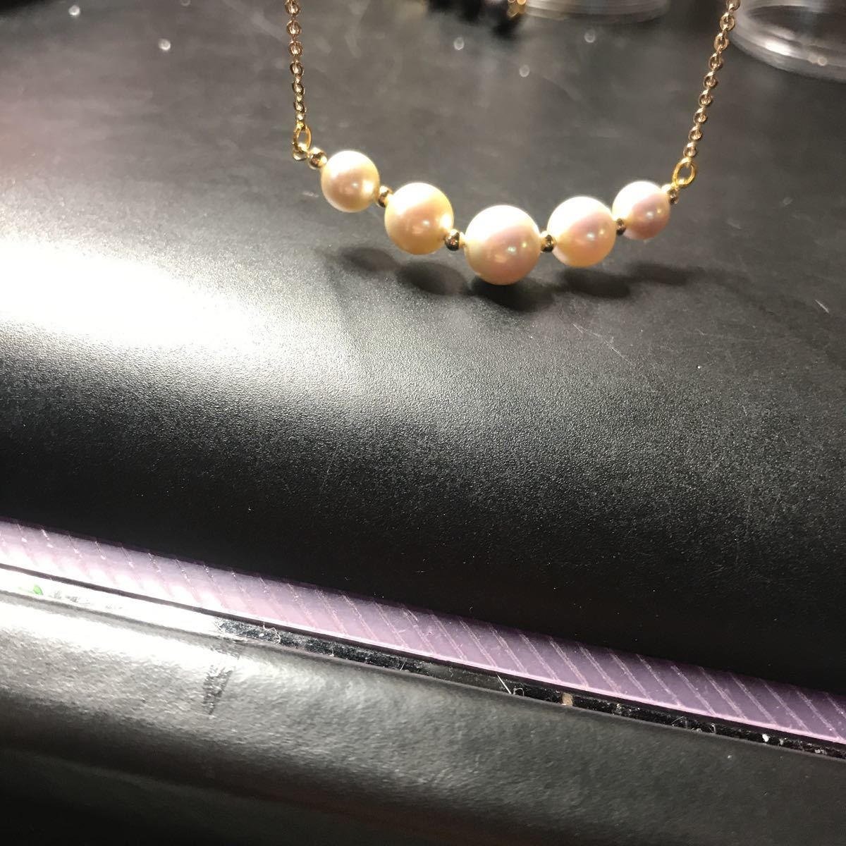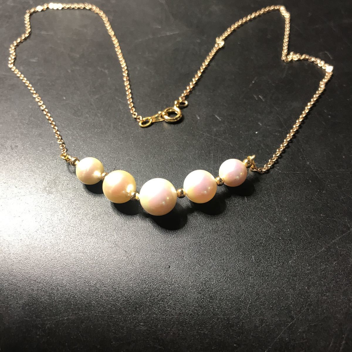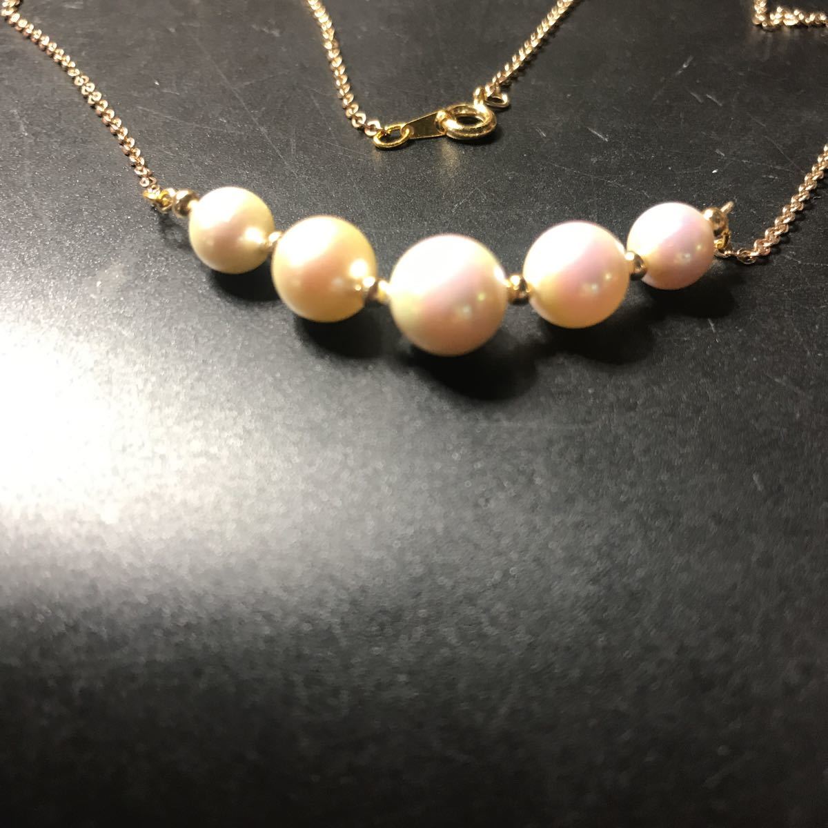 上質な貝パール使用しております、間にゴールドの18金GPのビーズを挟みチェーンをつけました。さりげなくてとても可愛いです、お手入れも楽なので普段使いにぴったりです