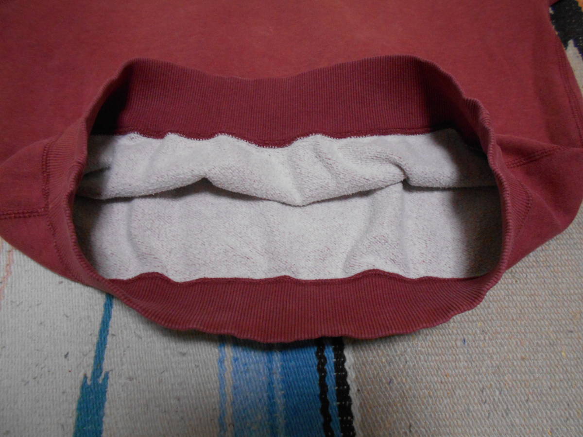 1960S スタイルの頑丈な四本針外縫い 縫製、肌触りの良いビンテージ スウェット素材感、旧染料の風合い有る あずき 斑色落ち感、ルーズ過ぎないボディーとスリーブシルエット、  等等...ノスタルジックな風合がとても良いテイスト